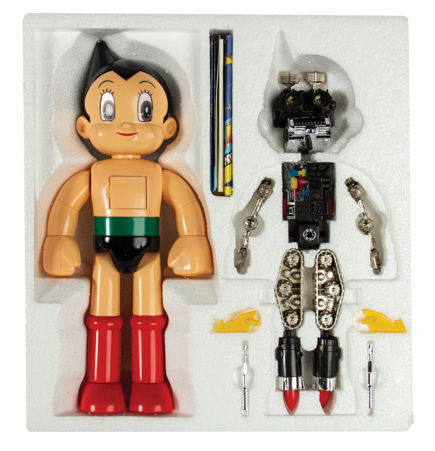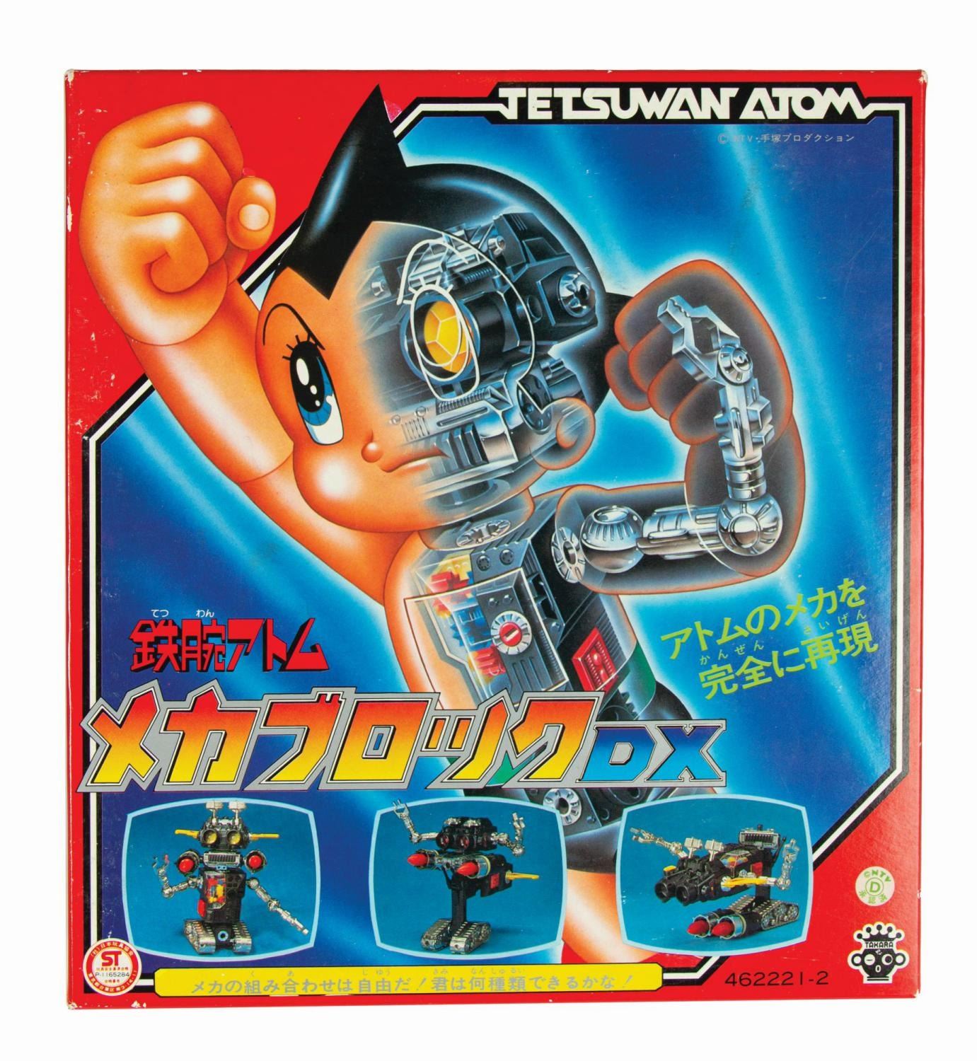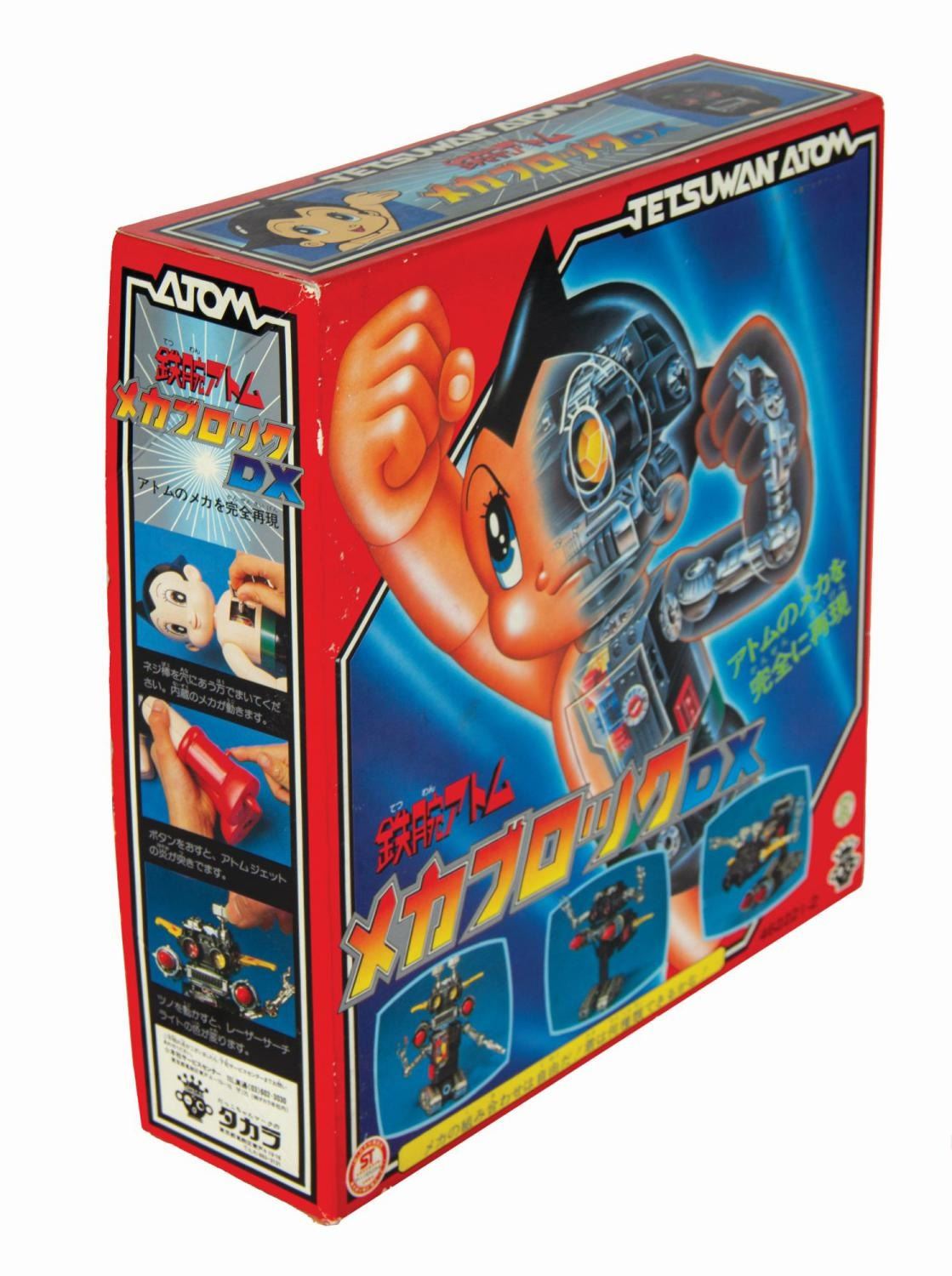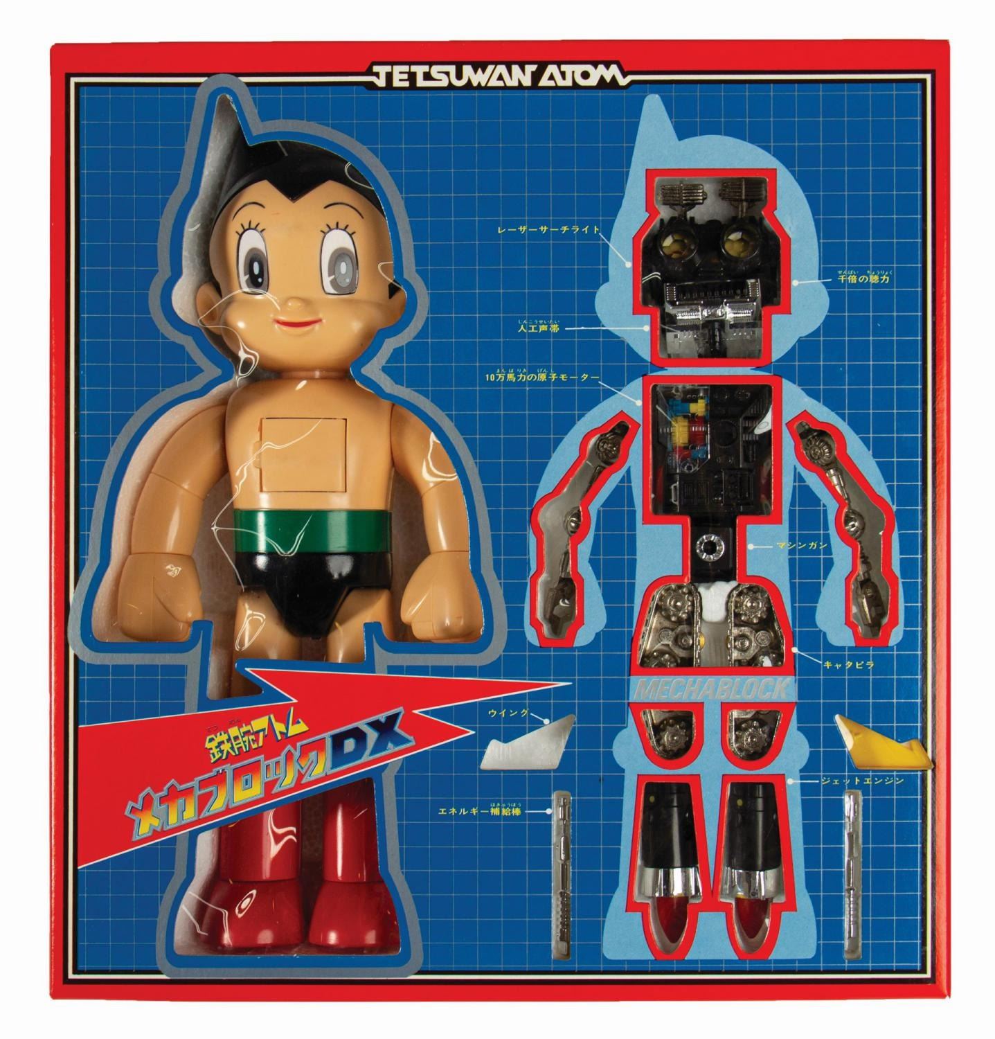 (Takara, c.1970s) A Mechanism Block DX (Deluxe) set manufactured by Takara as part of their Tetsuwan Atom line depicting iconic anime hero Mighty Atom (the Japanese moniker of Astro Boy) and his robot endoskeleton. The endoskeleton can be inserted into the hollow Astro Boy figure or built on its own in a variety of configurations. The toys, instruction manual, and unused decal sheet are housed in the original styrofoam and cardboard box with internal viewing window. The figure Astro Boy figure measures 10" tall and all the toy components are in fine, unused condition. The box measures 11.25"x10.25" and 3" deep and exhibits some surface loss at the edges and minor handling wear.