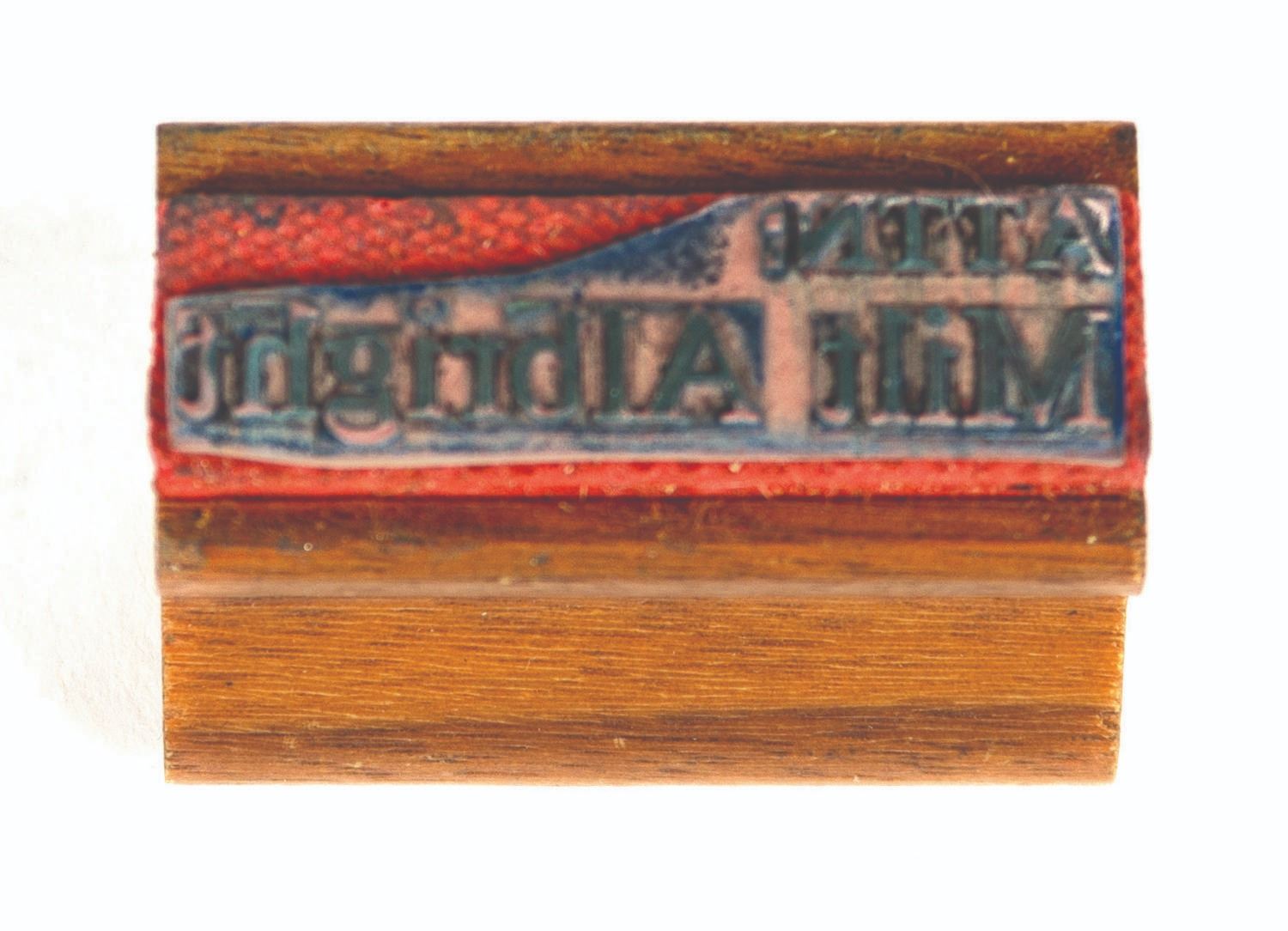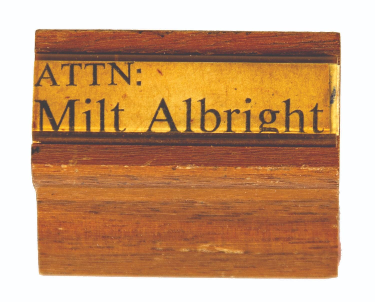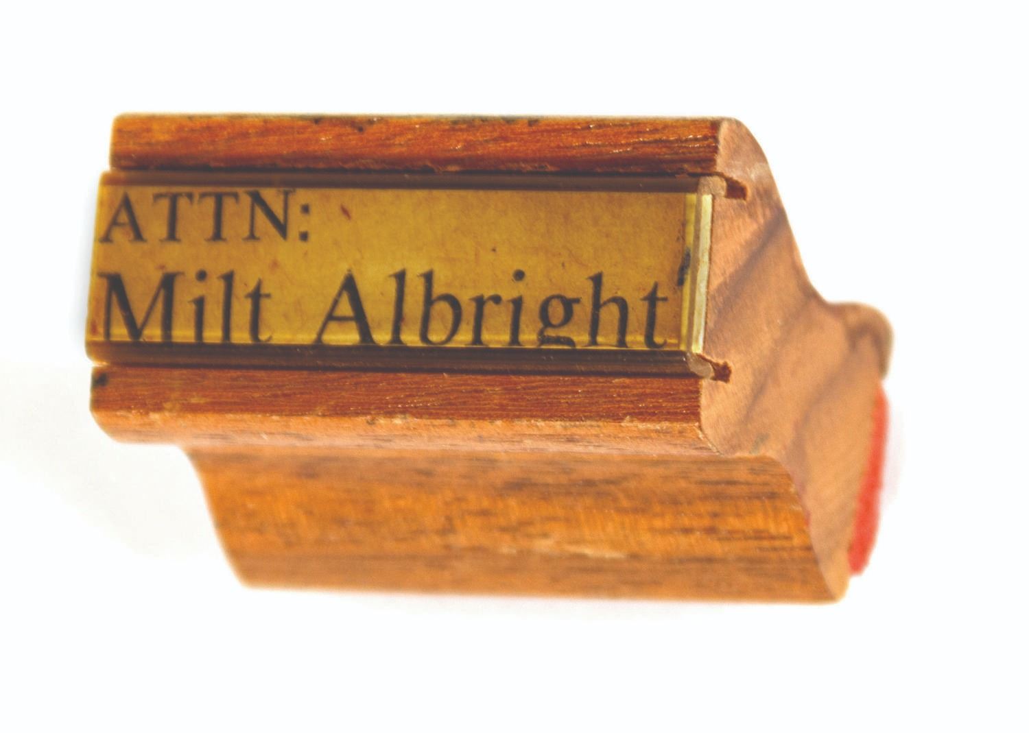 (Disneyland, c.1970s) A rubber stamp from the Disneyland offices and the collection of Disney Legend Milt Albright. The rubber stamp reads "Attn: Milt Albright" and has a wooden handle with a sample of the finished product in a plastic window at the top. Measuring 1.5"x1.5" and 0.5" deep, the stamp is in very good condition with wear from use.