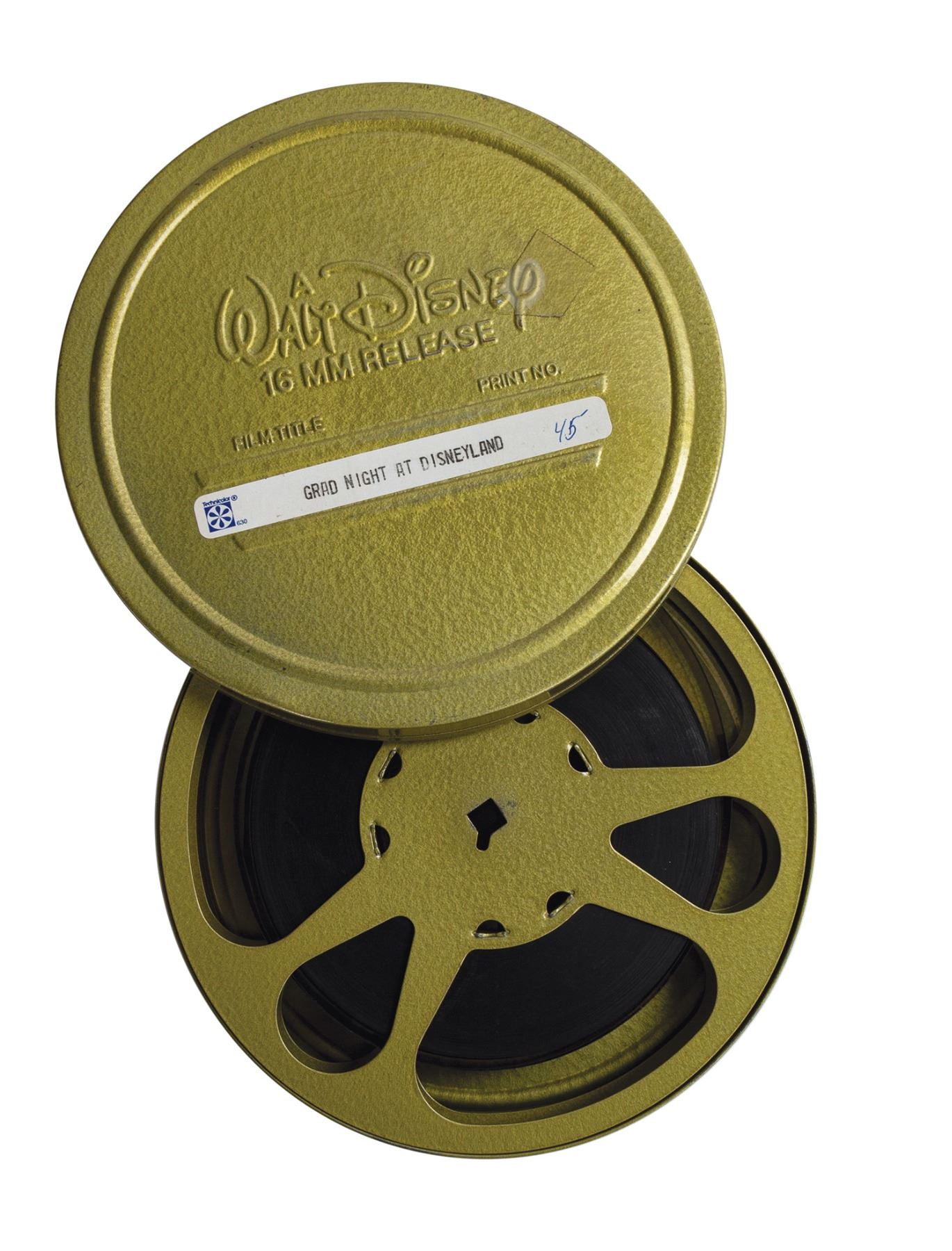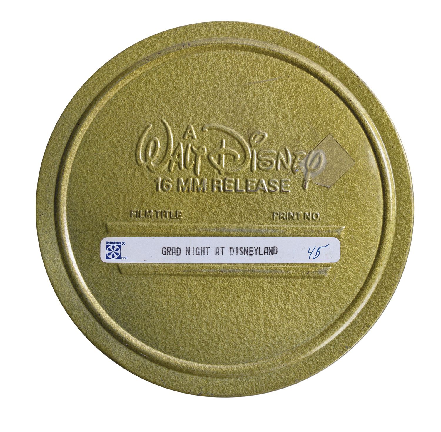 (Disneyland, 1985) An original 16mm promotional film labeled "Grad Night at Disneyland." This film belonged to Milt Albright, who developed the idea of Grad Nite in 1961. The film comes in a metal Walt Disney 16mm Release canister, and the film has a diameter of 5" on its 7" in diameter reel. The condition is very fine.