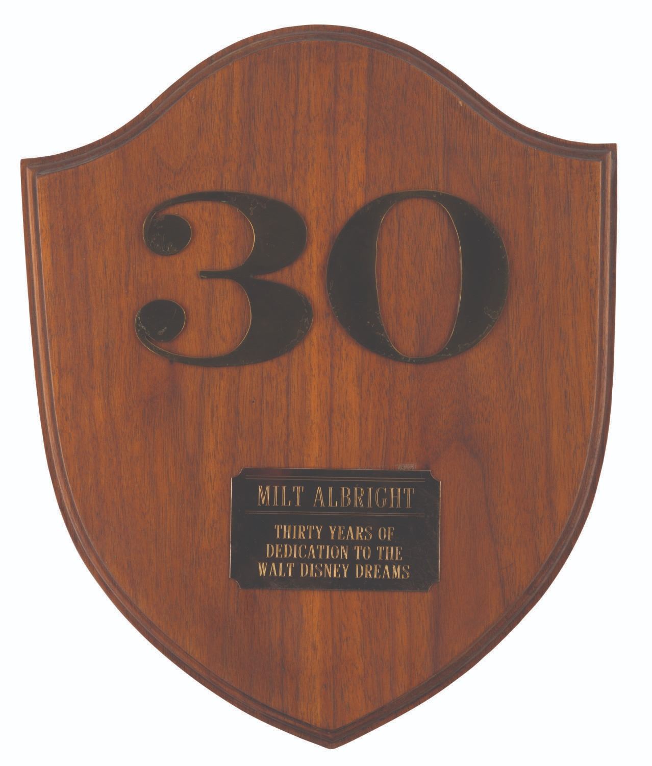 (Disneyland, 1977) A plaque awarded to Milt Albright upon his 30 years of continuous service with the Walt Disney Company. During his 45-year tenure as one of Disneyland's first 17 employees, Milt made significant contributions, such as founding the Magic Kingdom Club and Grad Nite. These achievements earned him the distinction of Disney Legend and a dedicated window on Main Street, located above the Opera House. The plaque measures 10” x 12” x 0.5” deep and displays in good condition with wear and scratches.
