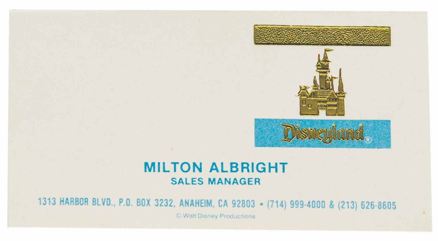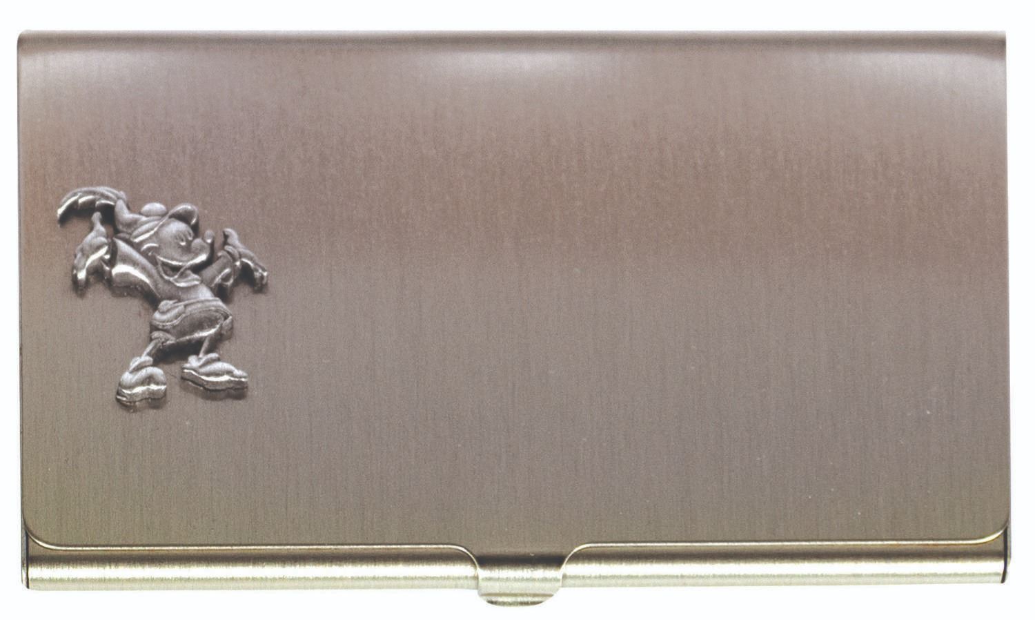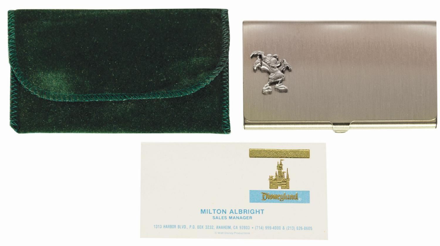 (Disneyland, c.1970s) A brushed metal business card holder with a relief figure of Mickey Mouse as The Brave Little Tailor at lower left. The case belonged to Disney Legend Milt Albright and contains one of his Disneyland business cards from his time as Sales Manager. Measuring 2.25"x3.75", the card case is in fine condition with minimal wear.