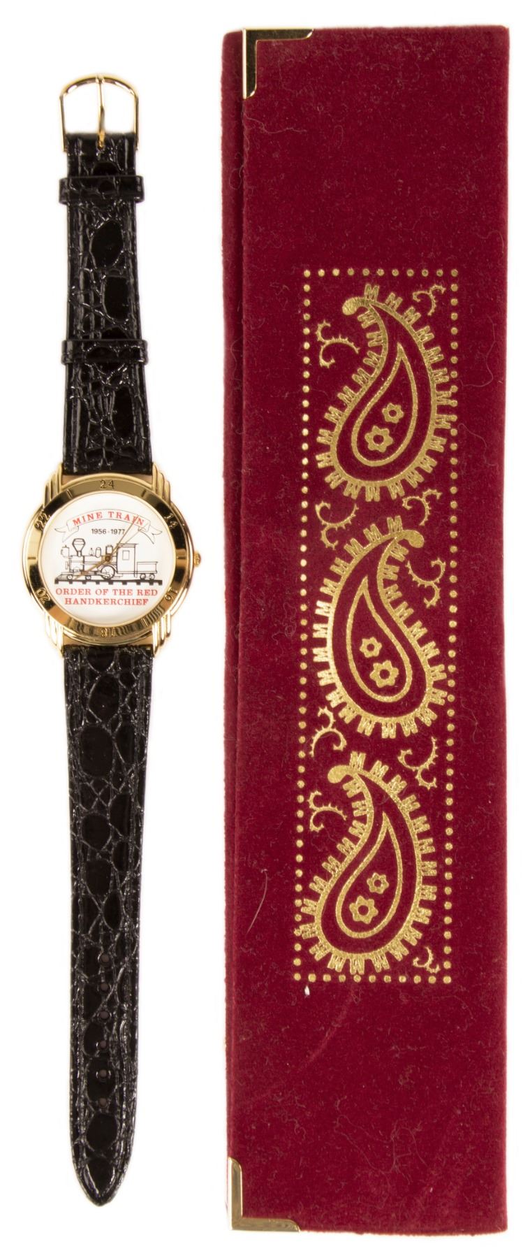 (Disneyland, c.1990s) A very rare limited edition watch created for a special semi-formal organization known as The Order of the Red Handkerchief. This group included a select number of original mine train operators and VIP members, that once included the likes of Walt Disney, Dick Nunis, Ron Dominguez, and Michael Broggie. The watch was created in an edition of only 200, and comes in a decorative velvet pouch. This watch is engraved on the back with the Disney copyright logo and 60/200. The watch band measures 9" from end to end, and the face measures 1.5" in diameter. The watch appears to be unused and is in very good condition.