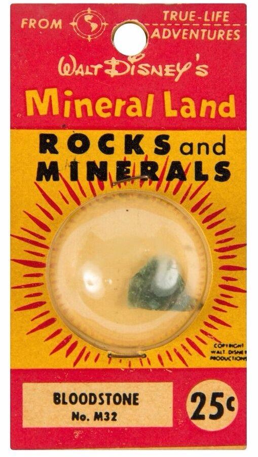 (Disneyland, c.1956) An original "Mineral Land - Rocks and Minerals" capsule from the "Mineral Hall", run by Ultra-Violet Products in Frontierland. This 15 cent "Olivine" comes in its original packaging with information about the stone on the back. This item measures 3.5"x2" and is in very good condition with minor wear to the packaging.