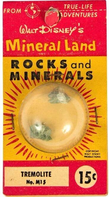 (Disneyland, c.1956) An original "Mineral Land - Rocks and Minerals" capsule from the "Mineral Hall", run by Ultra-Violet Products in Frontierland. This 15 cent "Tremolite" comes in its original packaging with information about the stone on the back. This item measures 3.5"x2" and is in very good condition with minor wear to the packaging.