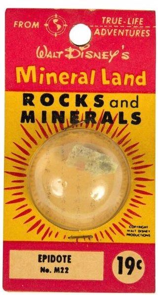 (Disneyland, c.1956) An original "Mineral Land - Rocks and Minerals" capsule from the "Mineral Hall", run by Ultra-Violet Products in Frontierland. This 19 cent "Epidote" comes in its original packaging with information about the stone on the back. This item measures 3.5"x2" and is in good condition with some wear to the packaging.