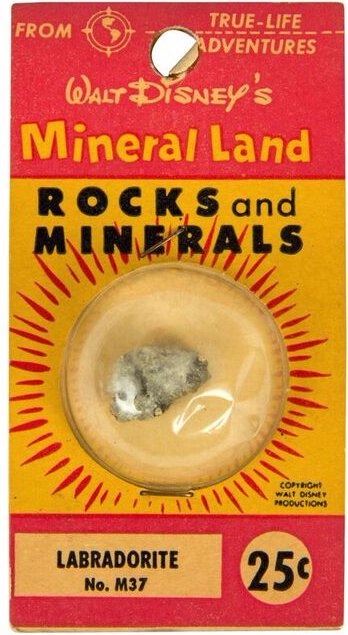 (Disneyland, c.1956) An original "Mineral Land - Rocks and Minerals" capsule from the "Mineral Hall", run by Ultra-Violet Products in Frontierland. This 25 cent "Labradorite" comes in its original packaging with information about the stone on the back. This item measures 3.5"x2" and is in very good condition with minor wear to the packaging.