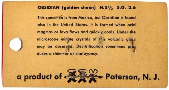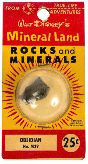 (Disneyland, c.1956) An original "Mineral Land - Rocks and Minerals" capsule from the "Mineral Hall", run by Ultra-Violet Products in Frontierland. This 25 cent "Obsidian" comes in its original packaging with information about the stone on the back. This item measures 3.5"x2" and is in very good condition with minor wear to the packaging.