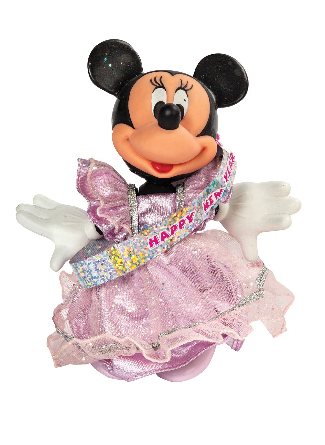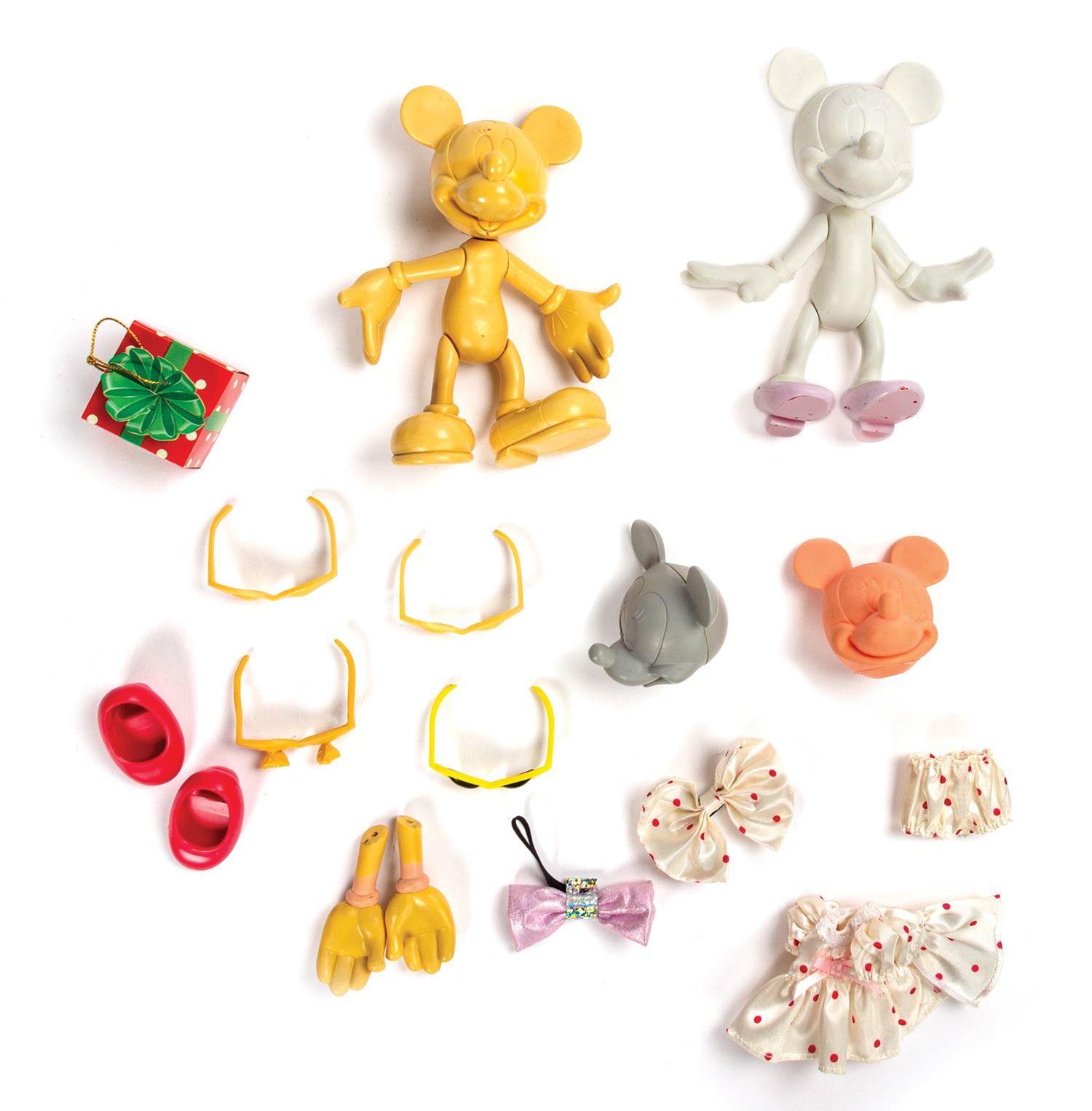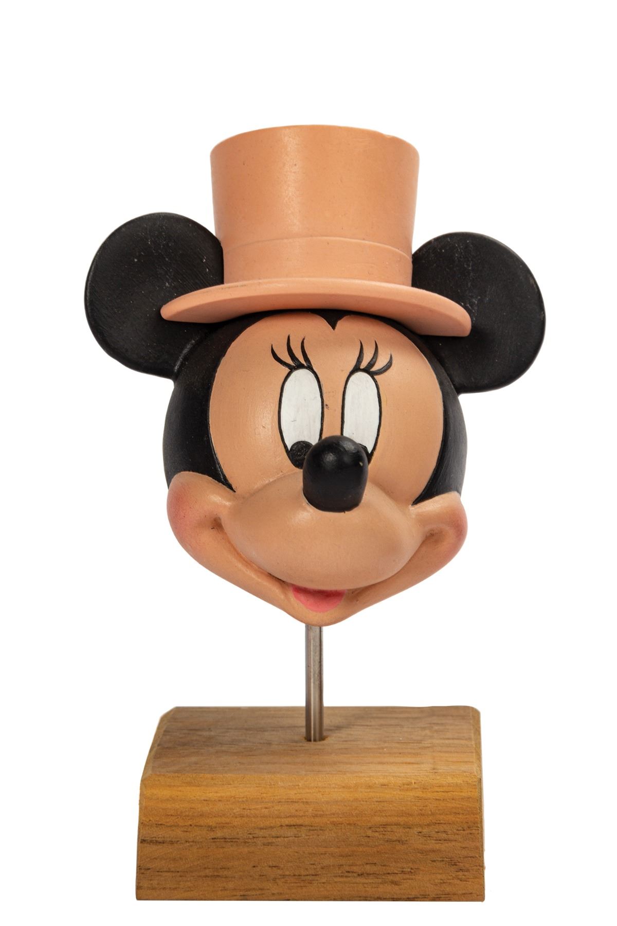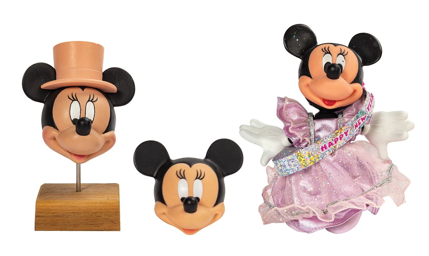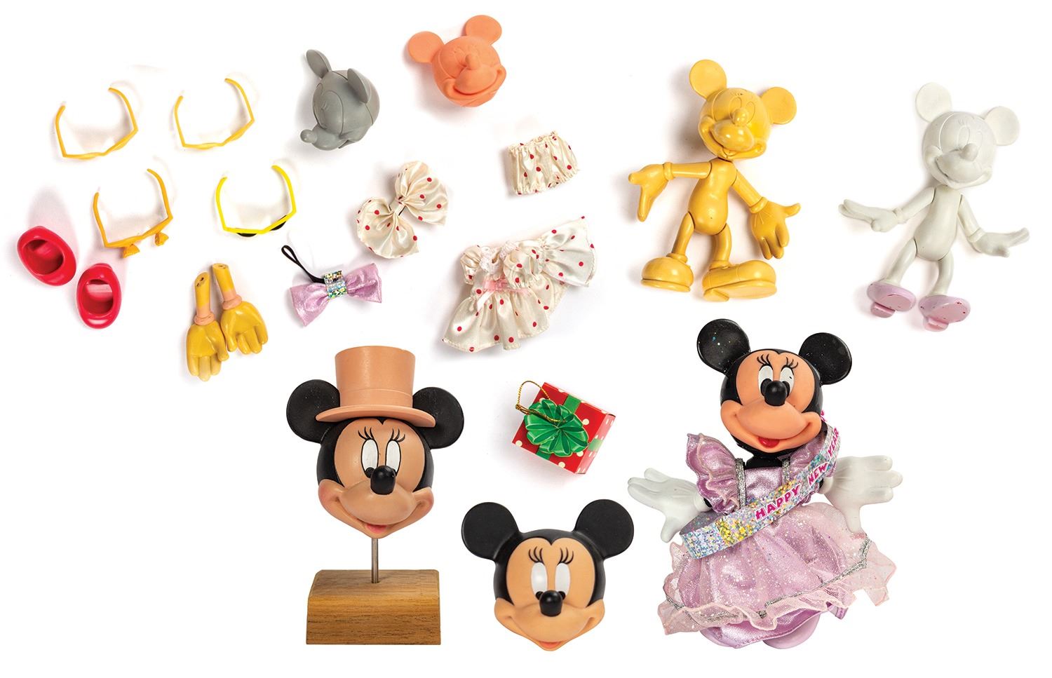 (Disney, c.1990s-2000) A collection of models and accessory pieces used in the development of a Minnie Mouse toy. The Minnie toy was developed with a New Year's Eve celebration theme, and includes accessory pieces such as sunglasses, party blowers, red shoes, and more. The collection includes a hand-painted maquette for Minnie's head that includes a removable top hat, (3) additional heads made of soft rubber and plastic in varying stages of completion, (2) full prototype Minnie figures with detachable limbs, a full Minnie figure in a New Year's outfit, and several additional costume and accessory pieces. The maquette measures 5" tall on its wooden block base, and the full figures measure approximately 6" tall. The set is in overall very good condition with some scuffs and wear throughout from use. It is unclear if this Minnie figure was ever produced, but these models provide an incredible look into the development of Disney's popular toys and figures.