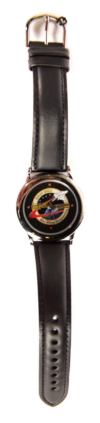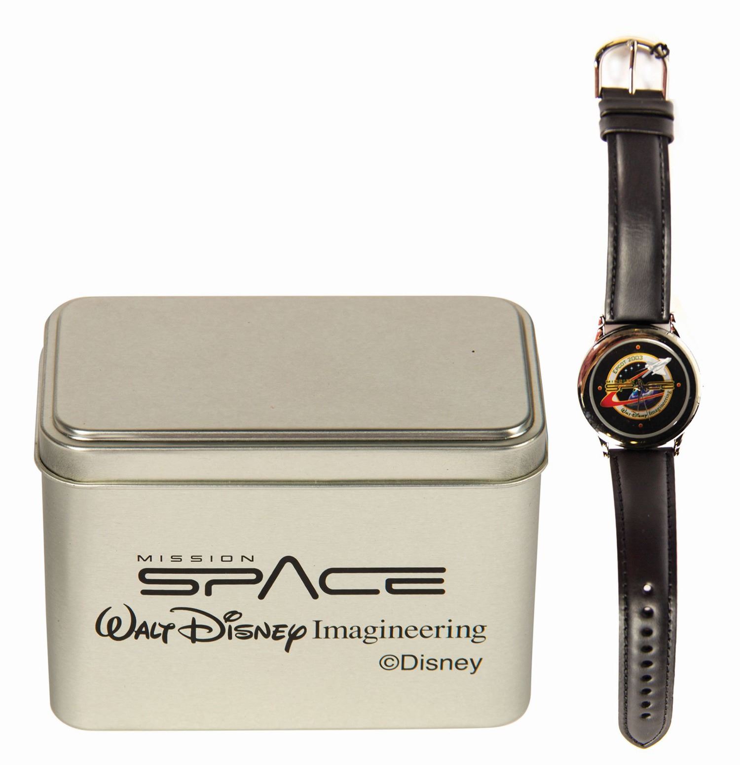(Epcot, 2003) A limited edition Relic-brand cast member wristwatch. Created to celebrate the launching of the Mission: Space attraction in Epcot's Future World, the watch is engraved with edition number 190/300. Presented in the original 3.25"x4.25"x2.5" display tin, the case measures approximately 1.75" in diameter and the black leather band measures 9.25" extended. Both are in very fine condition, with the watch still covered by its original protective plastic cling.
