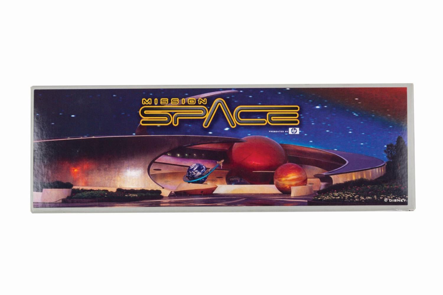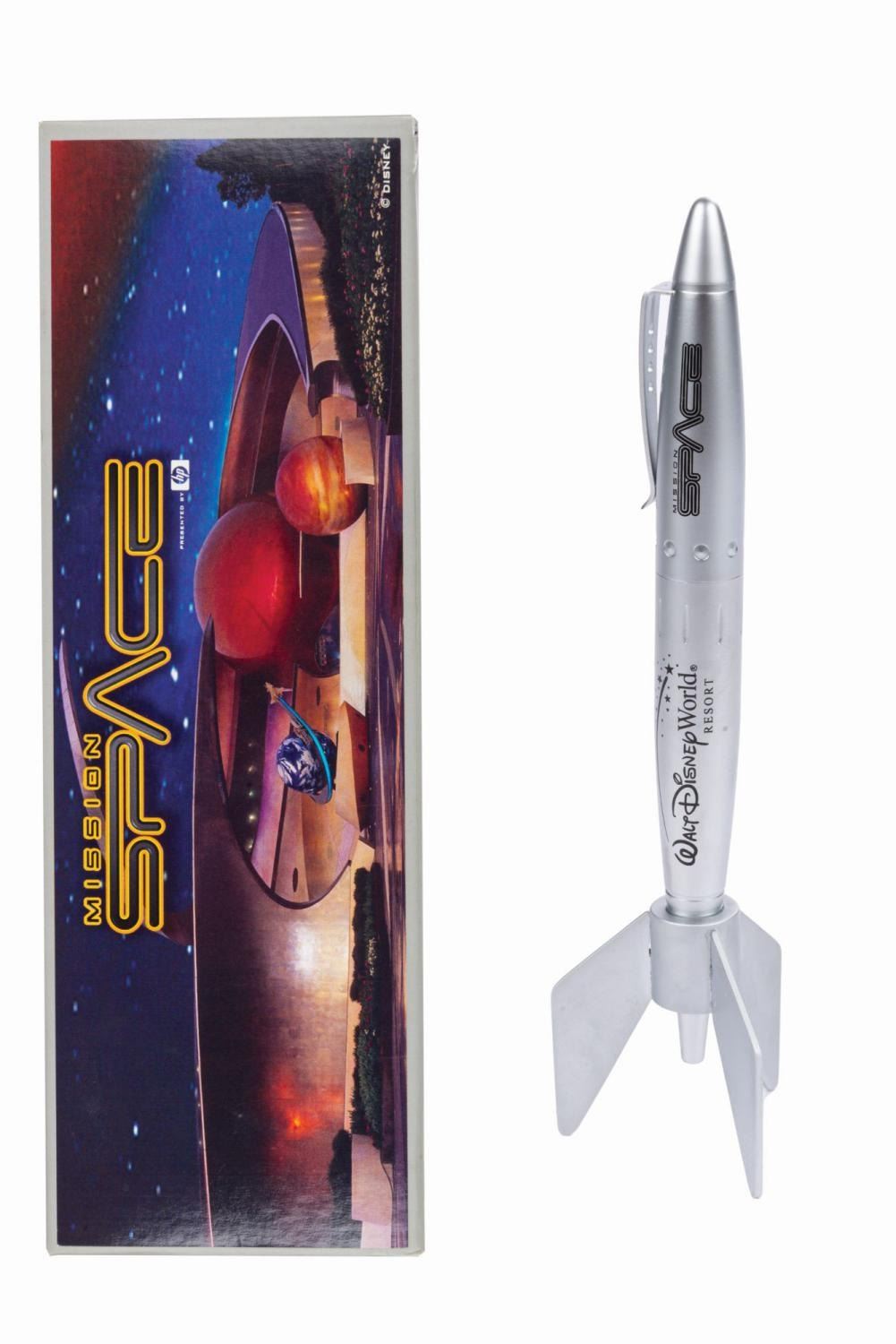 (Epcot, 2003) A very rare pen created in the opening year of Mission: Space at Epcot. The pen features applied text of "Mission Space" and "Walt Disney World Resort" and sits in its holder to form a rocket shape. It stands 6" tall on its holder. The pen is in very fine condition and comes in its original box and packaging.