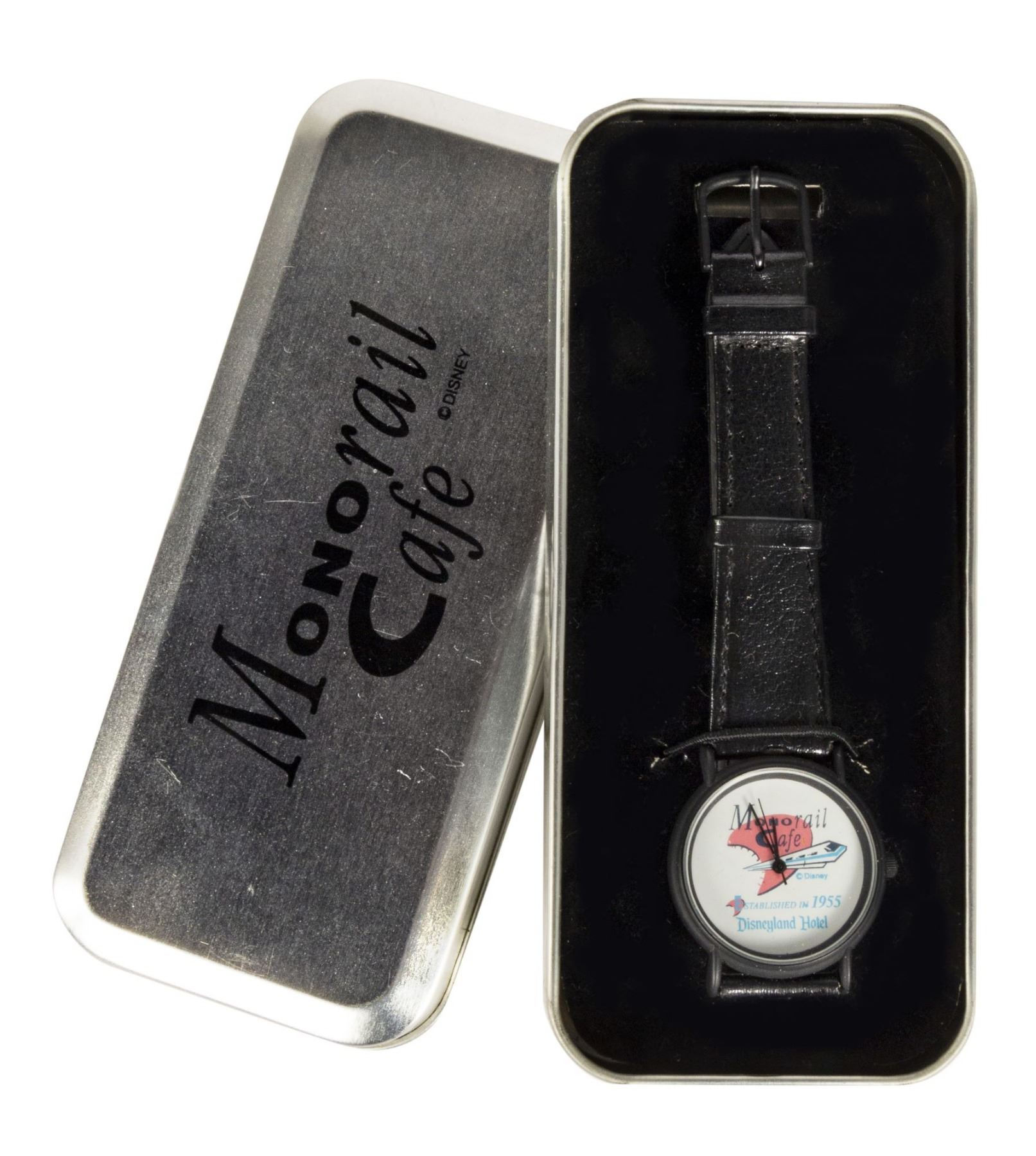 (Disneyland Hotel, 1990s) An original watch from the Monorail Cafe at the Disneyland Hotel. The watch has the logo for the restaurant on its face, with the name "Disneyland Hotel" below it with the phrase "Established in 1955". The back is stainless-steel. Measuring 8.5" long, the watch is in very good functioning condition.