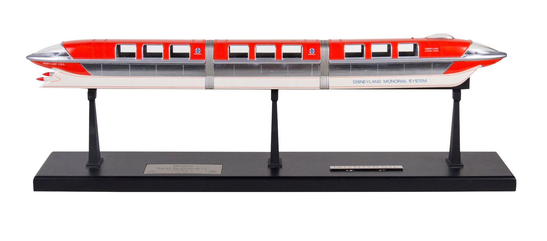 (Disneyland, 2005) As part of Disneyland's 50th anniversary, artists from Disney partnered with Master Replicas to create this limited edition die-cast red Monorail. Complete with working headlights, taillights, and top beacon, the replica was released in an edition size of only 1,959 pieces in a nod to the debut year of Disneyland's Monorail. The model itself measures 22" long and comes with a custom display stand with plaque. The condition is very good with some minor paint chipping and wear. The stand has a removable metal pin that reads "Monorail".