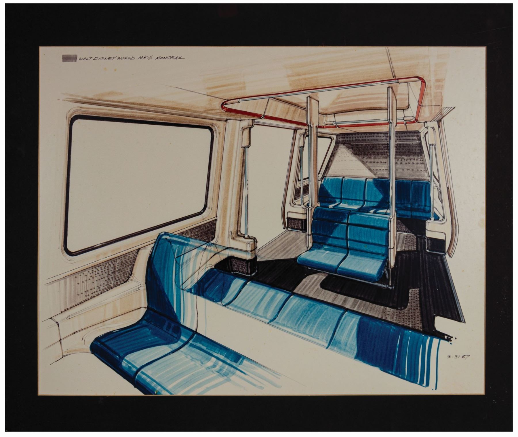(Walt Disney World, c.1987) A wonderful concept art print featuring a design by Imagineer George McGinnis for the interior of the Mark VI Monorail at Walt Disney World. The large print has an image size of 19"x25" within its original 25"x31" mat frame. The condition is fair, with moderate edge and corner wear from use and age and some moisture wear to the edges of the mat and backing board.