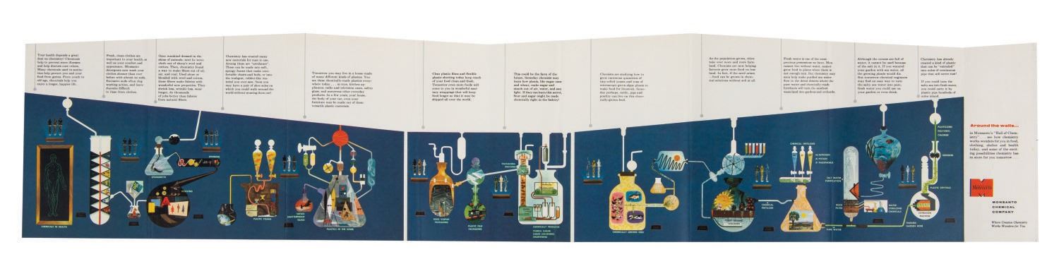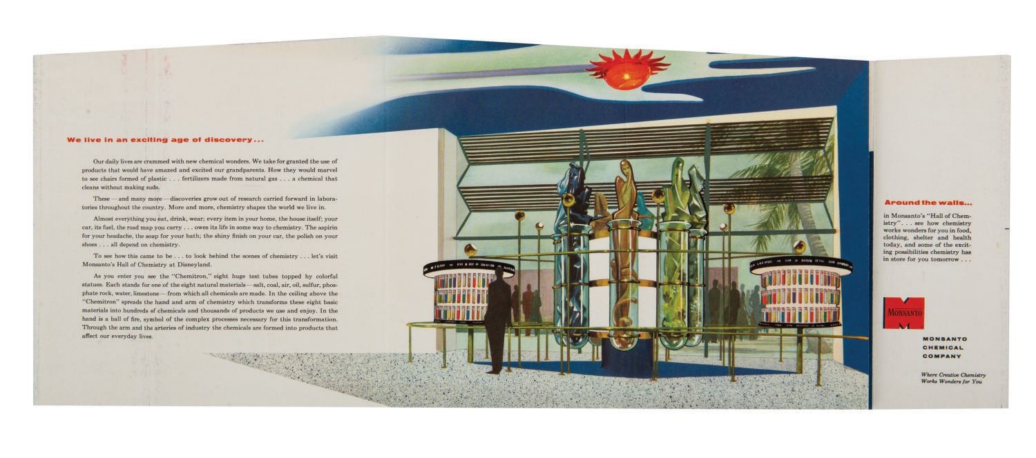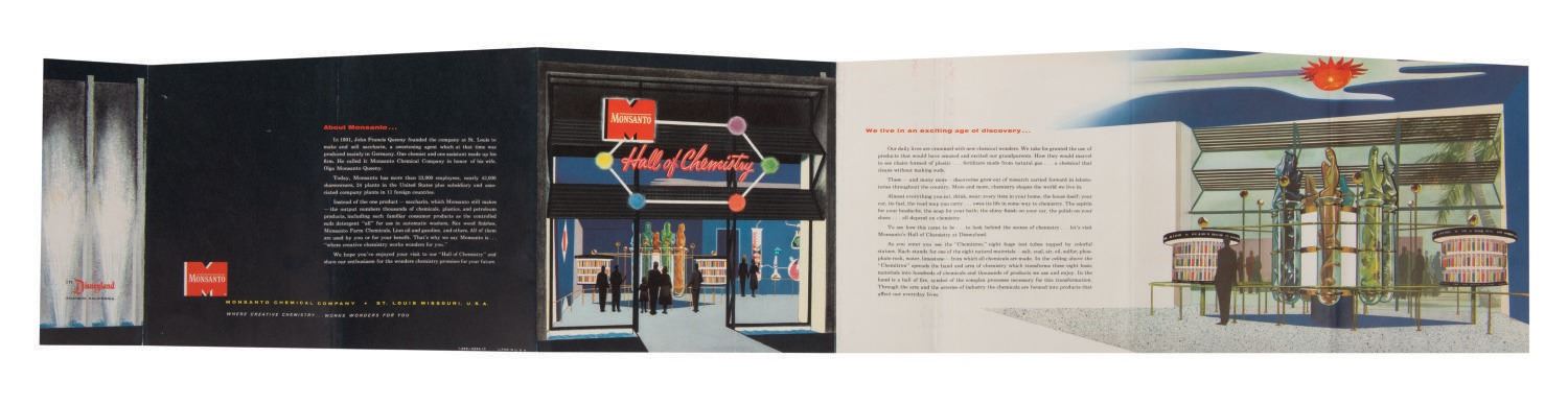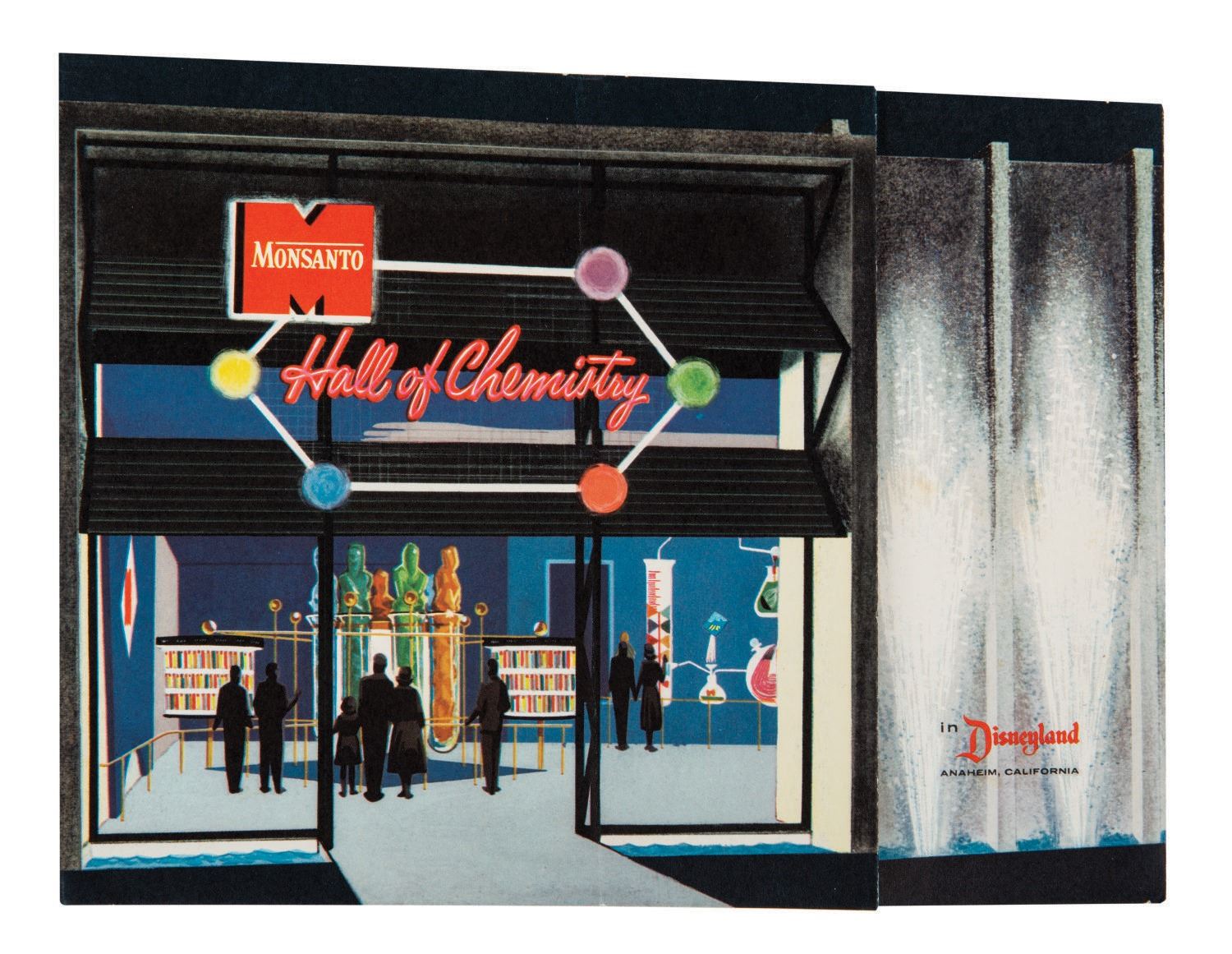 (Disneyland, 1955-58) A souvenir of Monsanto Hall of Chemistry in Tomorrowland at Disneyland. The exhibit brochure unfolds to tell the story of "the enormous contribution of chemistry to the world around us," preserving the look of the original exhibit's wall mounted displays with full-color illustrations. Measuring 9.25"x7.25", the brochure is in good condition.