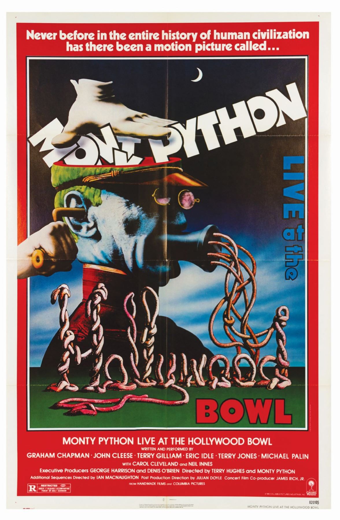 (Columbia, 1982) An original one sheet poster for Monty Python Live at the Hollywood Bowl. Original promotional materials from this short-lived concert comedy film are incredibly scarce. The poster measures 41"x27" and is in good condition with minor creases and wear. The poster has been folded, as originally distributed.
