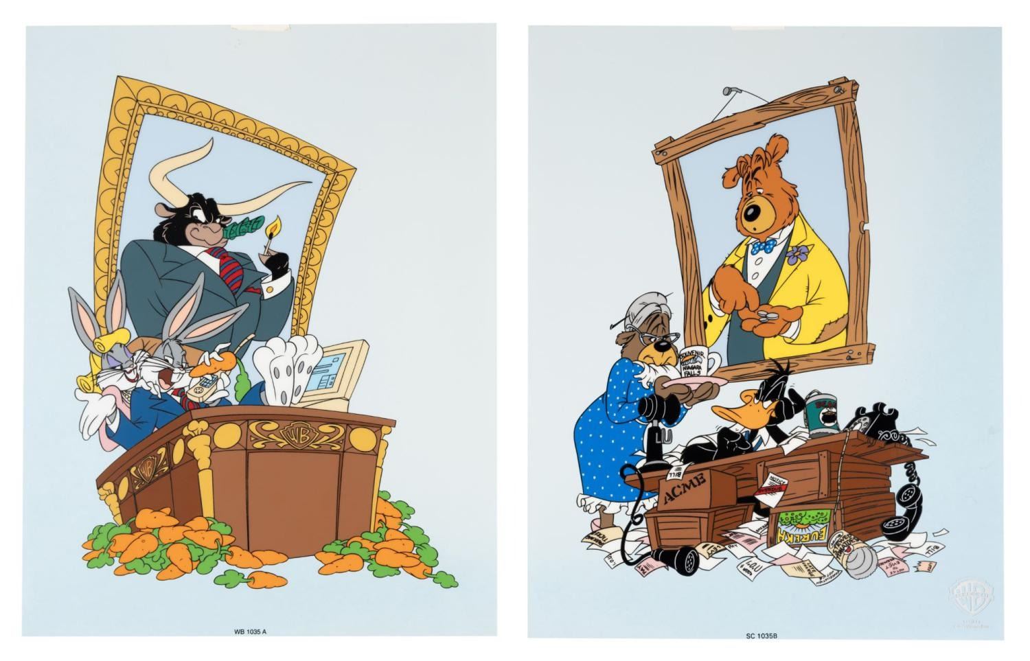 (Warner Brothers, 1997) An original pair of limited edition 5000 sericels featuring characters from the Looney Tunes. Titled "More Bull Than The Market Can Bear," the sericels feature Daffy Duck, Bugs Bunny, Honey Bunny, Junior Bear, Mama Bear, and Toro the Bull. The set depicts a classic Wall Street scene, contrasting a bullish Bugs wafting in his wealth as Daffy struggles to keep his office together due to his lackluster, bear market investments. Each measuring 13.5" x 10.5" overall with the character image measuring 11" x 8.5", the set is in very good condition with light handling wear.