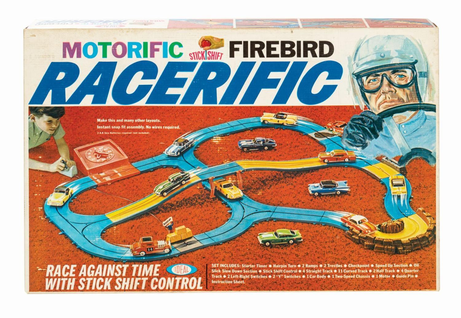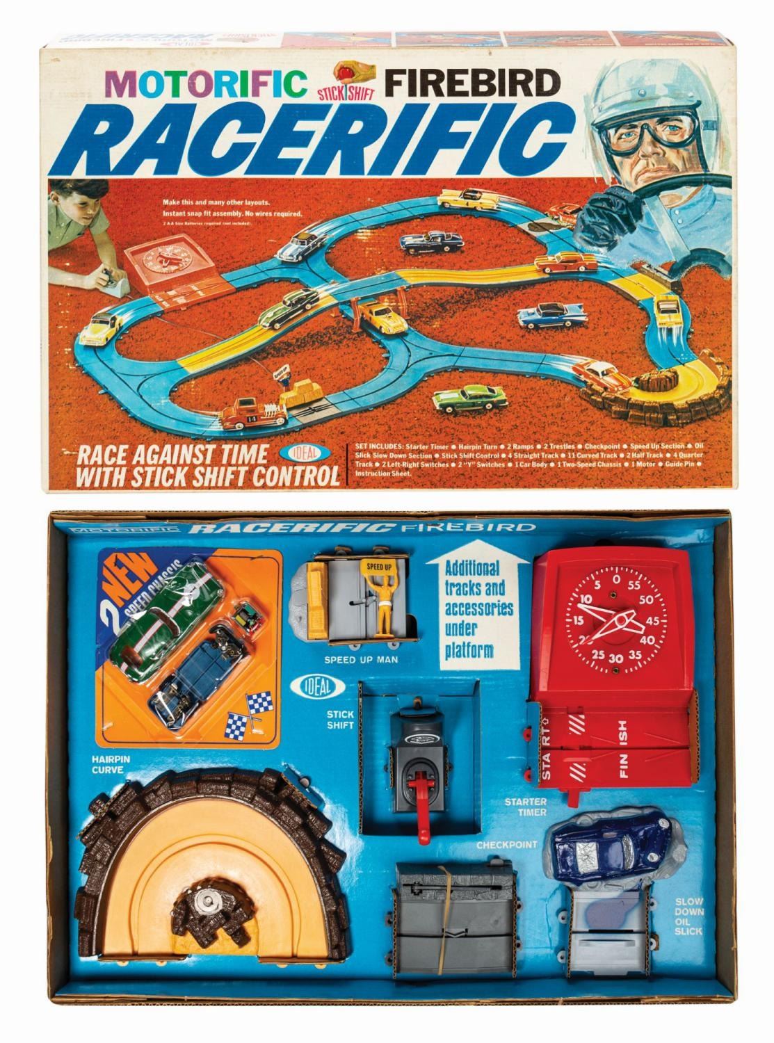 (Ideal, c.1968) A Motorific Firebird Racerific racing set by Ideal with (6) accessory sets. The racing set includes a car body and two-speed chassis, starter timer, stick shift, hairpin curve, slow down oil slick, check point, and various track pieces. Among the accessory sets are (3) sets of 6 Curved Tracks, (2) sets of 6 Straight Tracks, and a Remote Control Unit. The box measures 16.25"x23.75" and 3.25" tall, while the accessory sets range from 11"x8 to 10.25"x8.25". The racing set is in very good condition with some surface and edge-wear, including discoloration along the top edge and some color loss. The accessory sets exhibit edge-wear including peeling and bending, some separation of the packaging plastic from the backing, and general surface wear from age.
