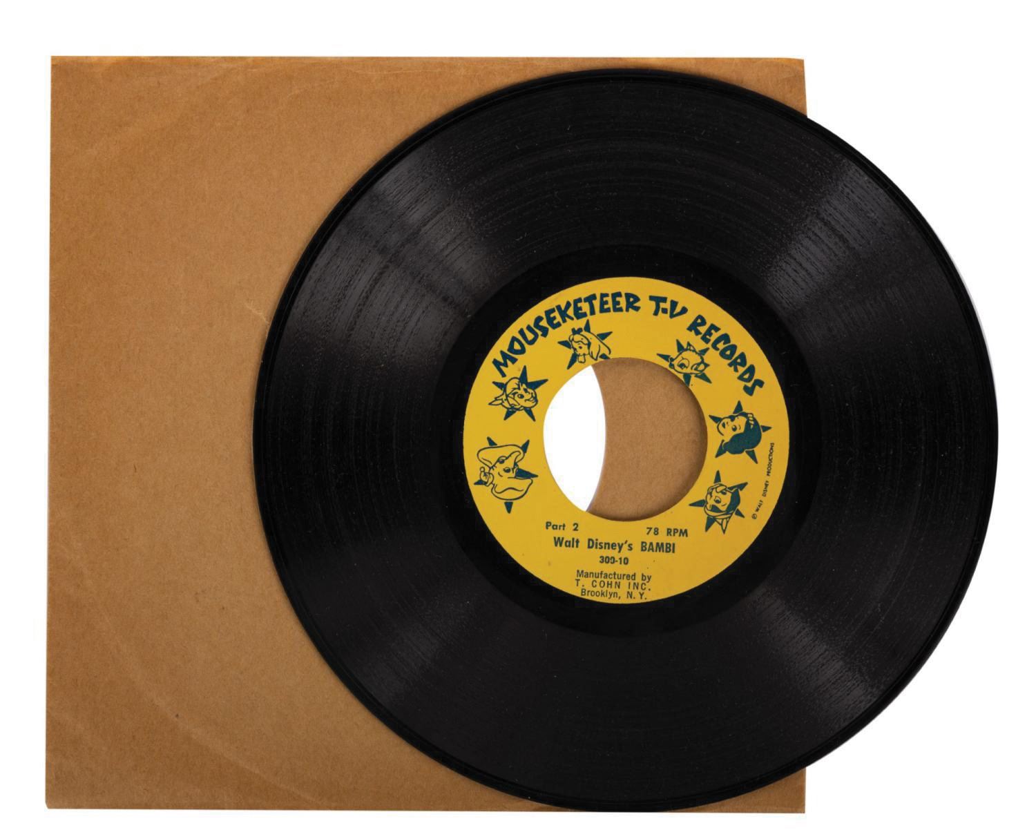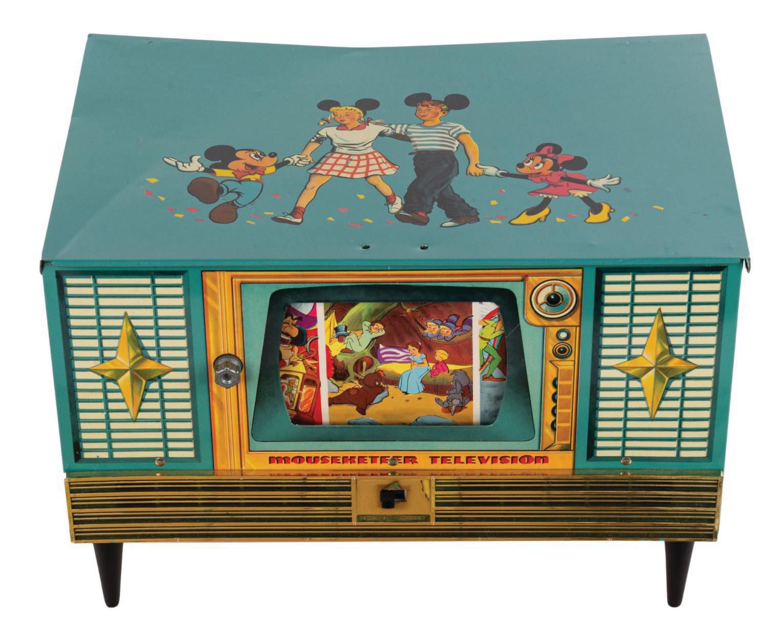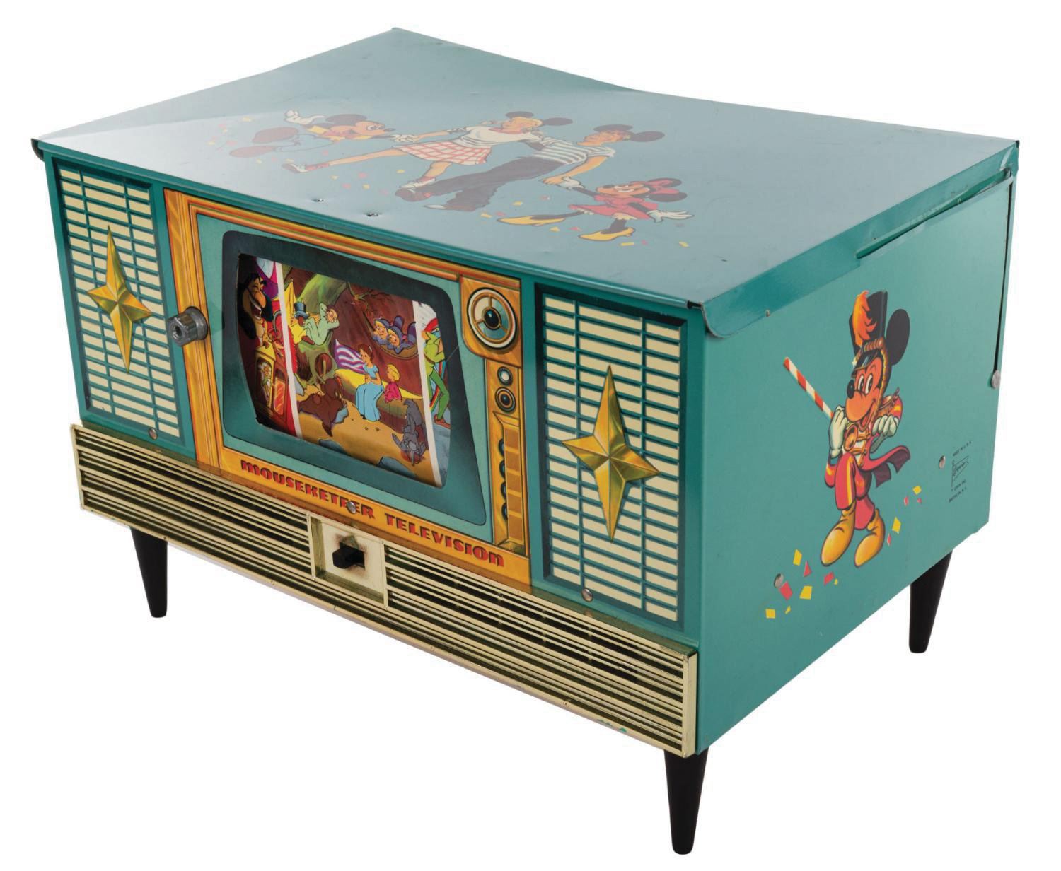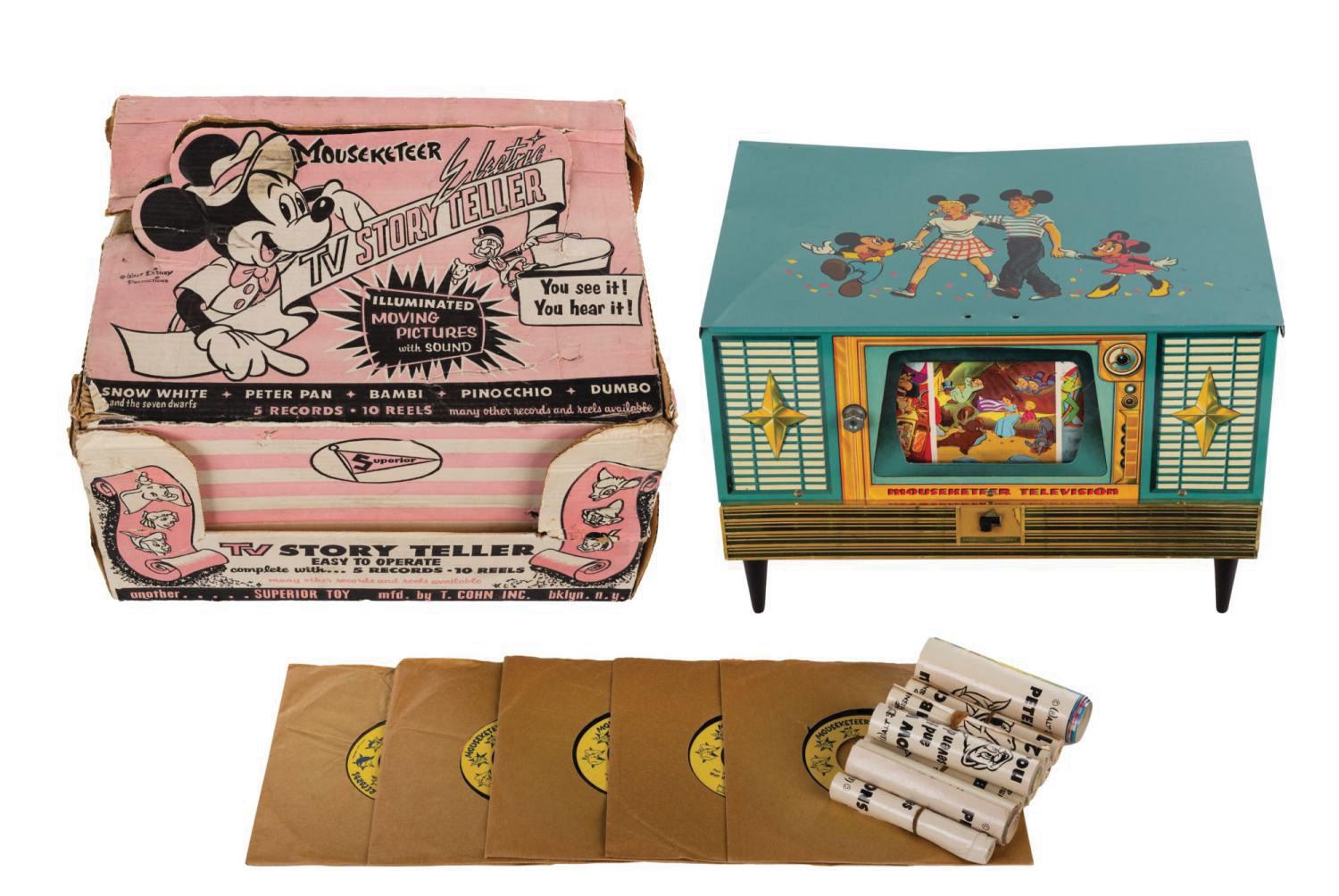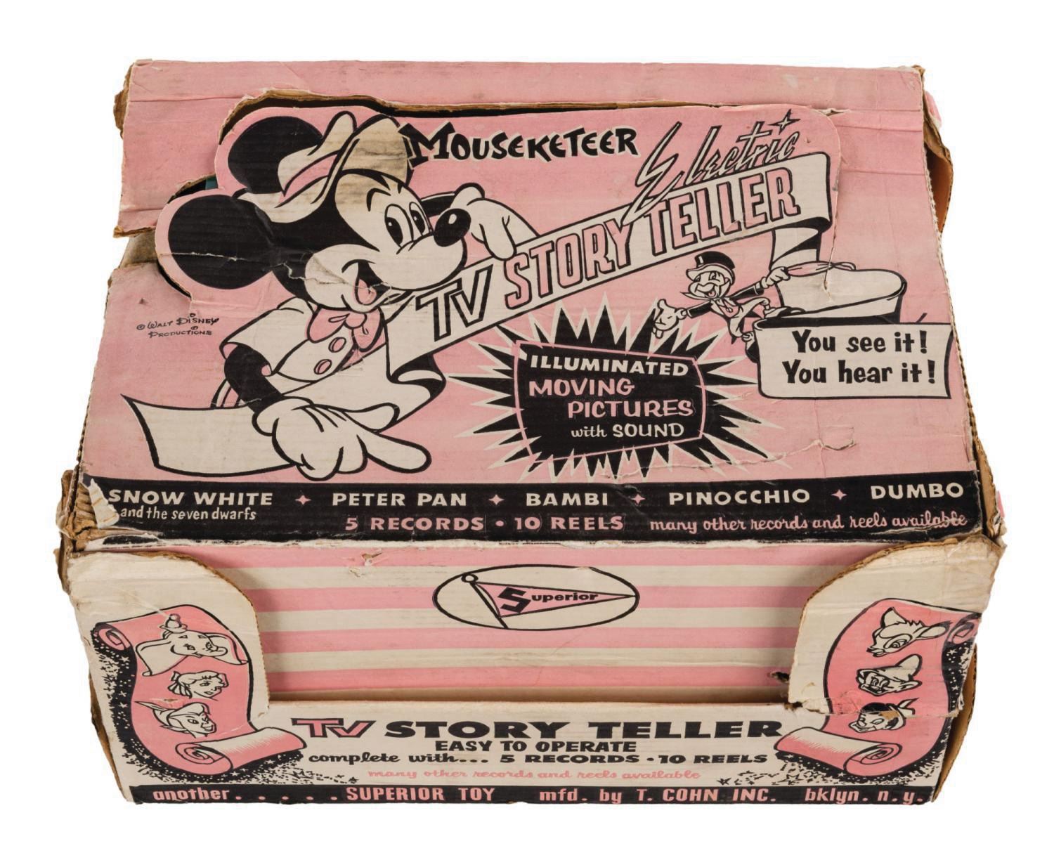 (Disney, c.1955) A Mouseketeer Electric TV Story Teller toy by Superior. The electric phonograph features illuminated moving pictures with sound, (5) records, and (10) picture reels in the original box and packaging. Measuring 13.5"x8"x9.25", the electric TV toy is in fine working condition, exhibiting only minor dents and scratches, and little wear to the lithographic Mouseketeer imagery. The 45 rpm records with sleeves and reels are in very good condition with little wear. The box is in fair condition with moderate wear, small tears, and creases throughout.