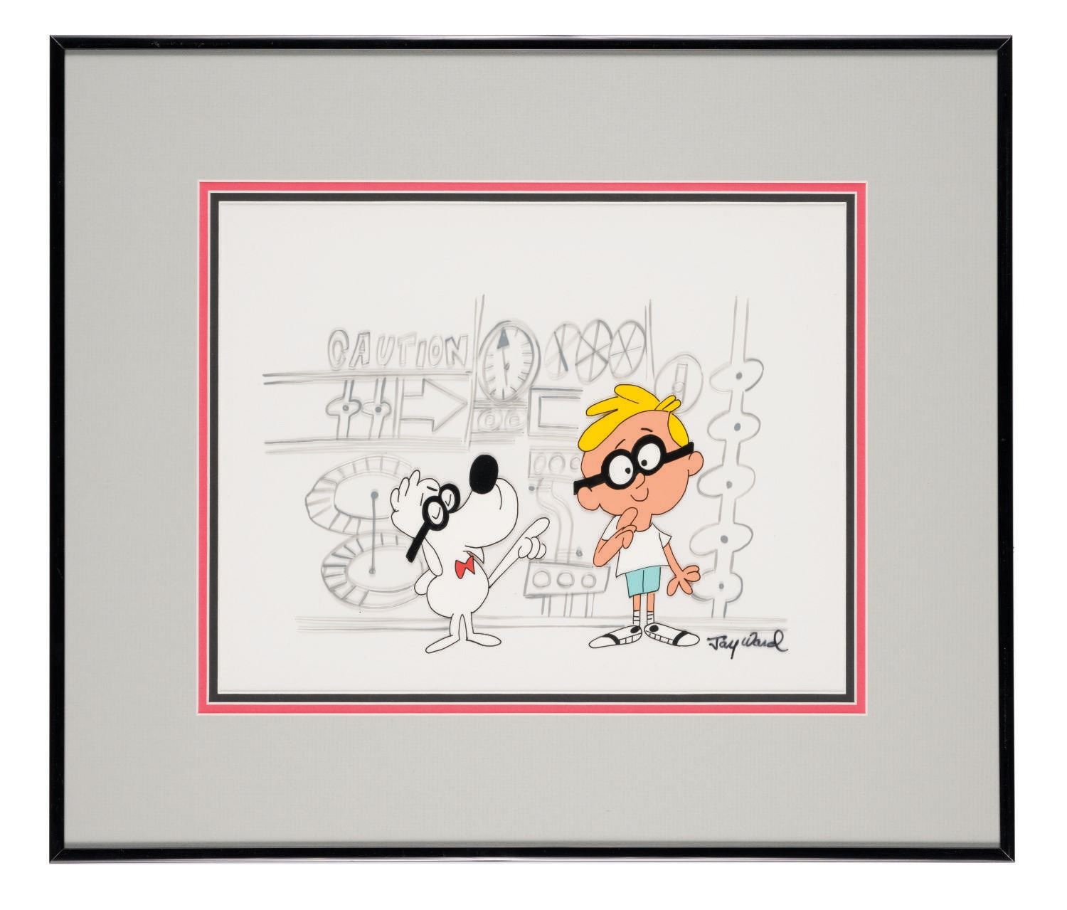 (Jay Ward, 1980s) A "scene" cel of Peabody and Sherman from the Rocky and Bullwinkle show, produced at Jay Ward Studios and signed by producer Jay Ward. In 1971 Jay Ward opened the Dudley Do-Right Emporium next to his studio on Sunset Blvd in Hollywood. Besides selling memorabilia related to his shows, Ward also sold hand-painted "scene cels" like this one that he would often sign for patrons. Because most of his productions were done in Mexico, these cels became some of the only artwork available from many of his shows. The untrimmed cel is matted with a 9"x11.5" opening. The artwork is in fine condition.
