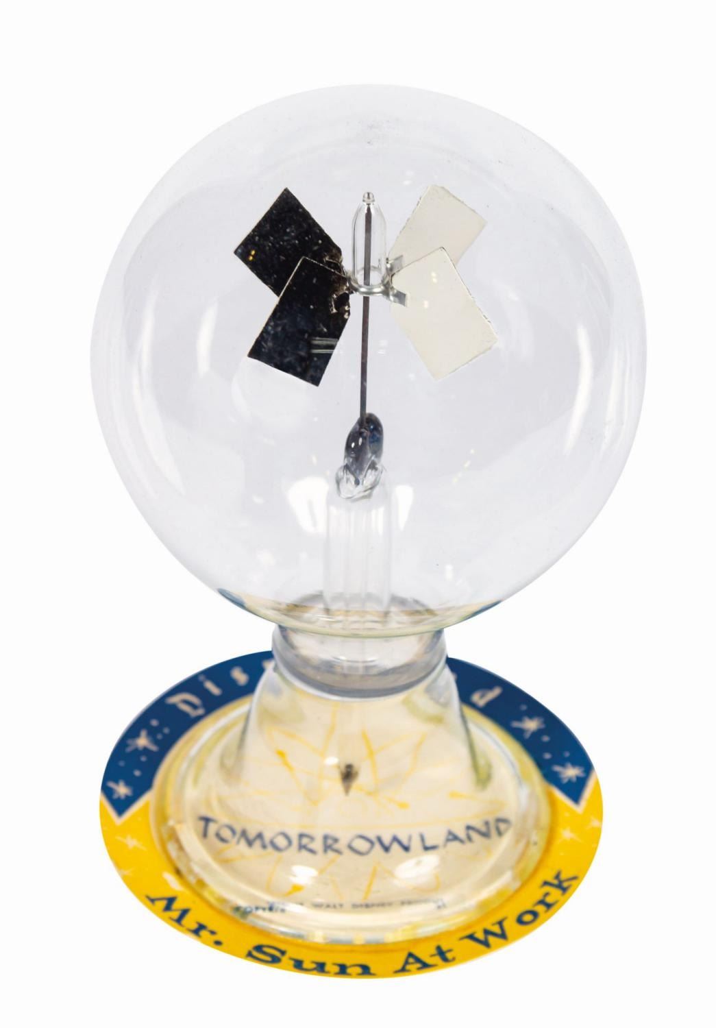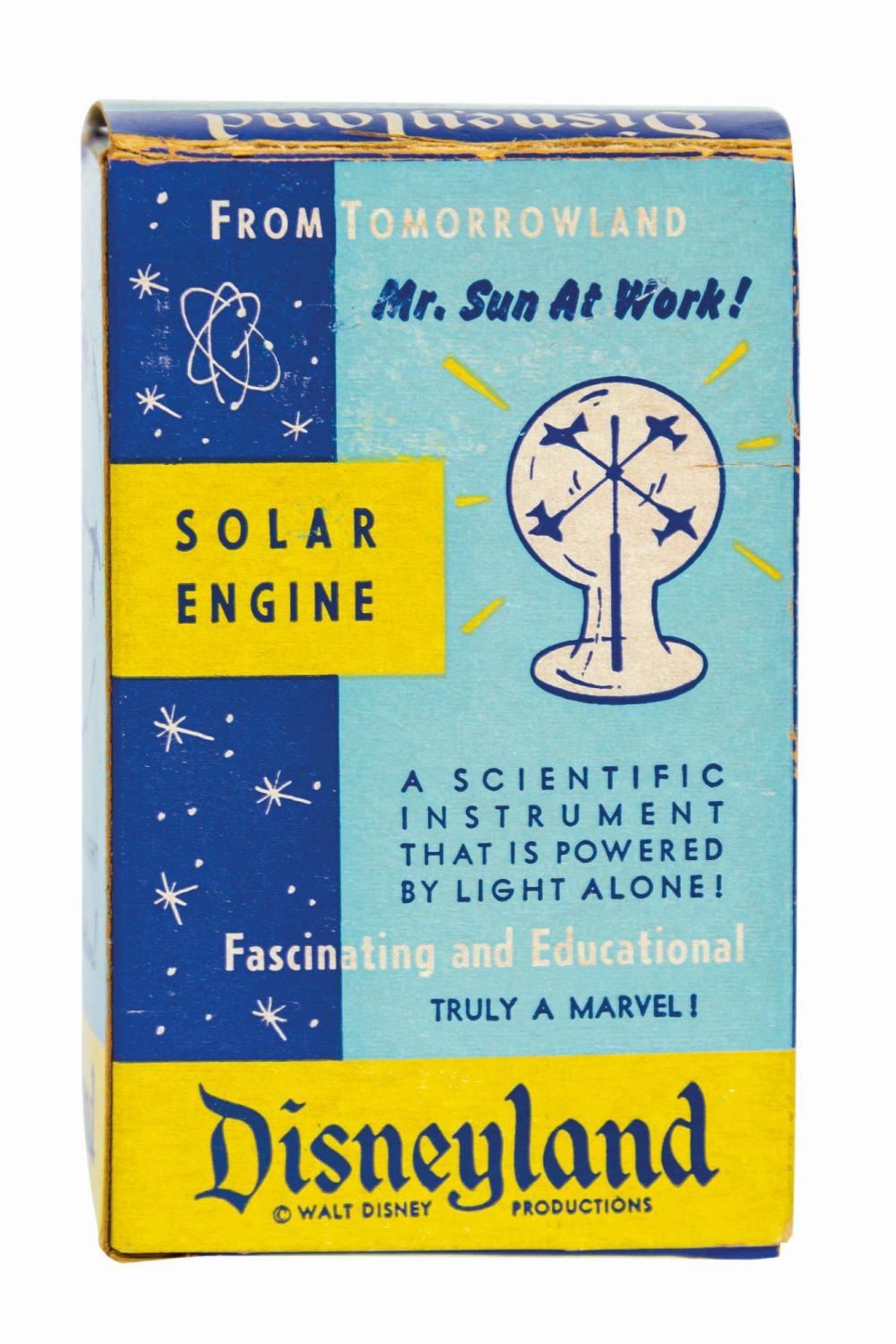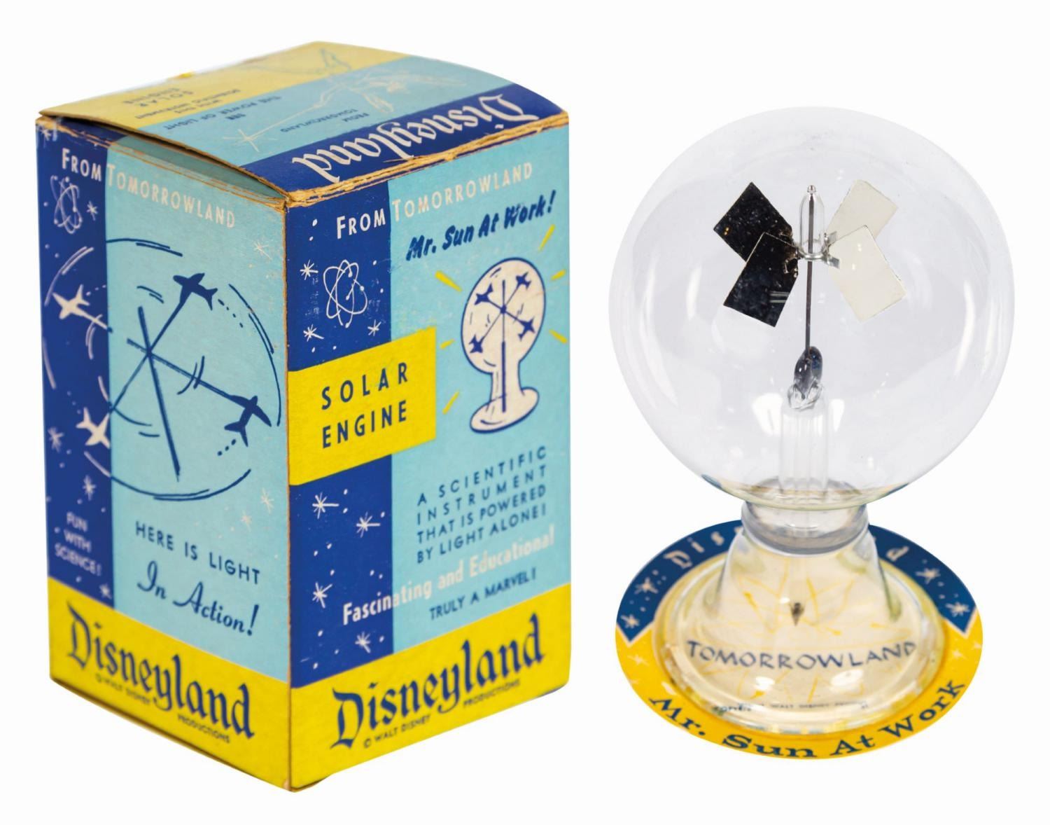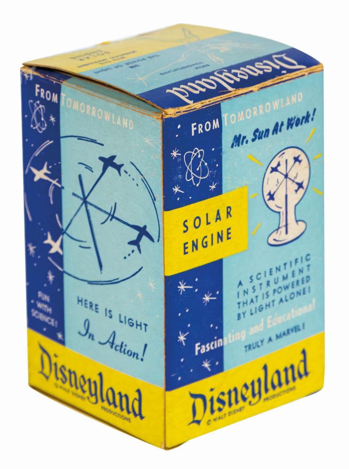 (Disneyland, 1956) A delicate solar engine toy from the early days of the park in its original box. This toy is powered by sunlight, which makes the diamond-shaped blades spin around. Included is paper insert which asks, "What makes this radiometer turn?" The toy measures 5" tall and 3" in diameter in the 5.25"x3.25" and 3.25" deep box. The condition of the toy is very good, with some minor surface wear. The box has some edge-wear and moisture discoloration near the bottom, but it has not affected anything within the box. There is minor tearing on the flaps and tearing on the hinges of the lid has been repaired with brown tape. The paper insert shows discoloration and surface wear from age.