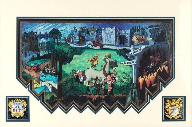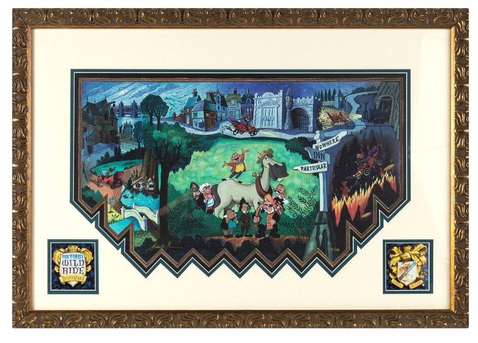 (Disneyland, 1999) A pair of rare limited edition items from the "Mr. Toad's Enchanted Evening" event at Disneyland on October 28, 1999. This pair includes a signed lithograph by John Kavelin featuring the mural artwork from the "Mr. Toad's Wild Ride" attraction numbered 9/150, and a pin of Mr. Toad which was limited to 1000 pieces. The pin comes in original tin with inner packaging and the artwork includes its certificate of authenticity from Disney. The artwork measures 19.75"x28.25" and the pair is in very good condition with little wear.