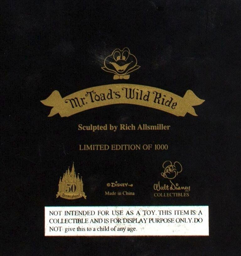 (Disneyland, 2005) A beautiful limited edition die-cast metal attraction vehicle based on "Mr. Toad's Wild Ride". This model was sculpted by Rich Allsmiller for Disneyland's 50th Anniversary, and features a green and yellow vehicle with "Cyril" across the front. The vehicle comes on a black base which notes the anniversary on the bottom. This vehicle was created in a limited edition of only 1000 pieces, and is a beautiful representation of one of the most iconic attraction vehicles. This item measures 6"x8" and 5.5" tall, including the base. The vehicle is in very good condition with a few flakes of paint missing in the wheels and grill, as is typical with this limited edition due to the type of grey paint used.