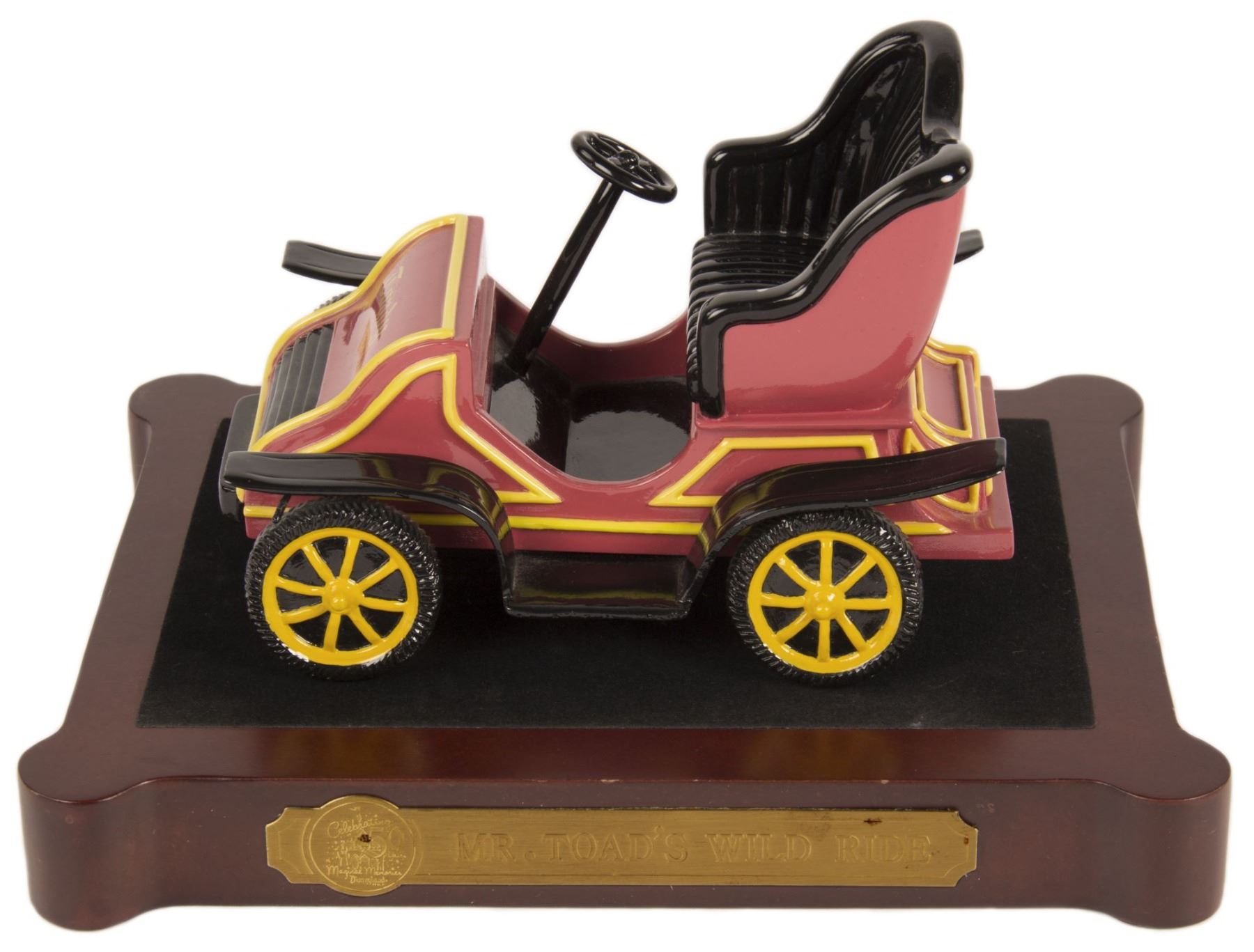 (Disneyland, 2005) A beautiful limited edition model of an attraction vehicle from Mr. Toad's Wild Ride. This model reads "Toady" on the front and includes a wooden base with a plaque that notes the 50th anniversary of the attraction. The model is accomplished in resin in an edition of only 200. Measuring approximately 5" tall including its base, the model is in very good condition with minor wear from previous display. The original box and certificate of verification are included.