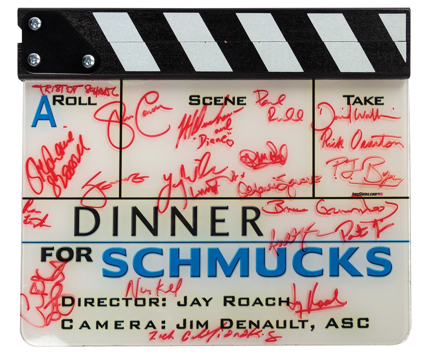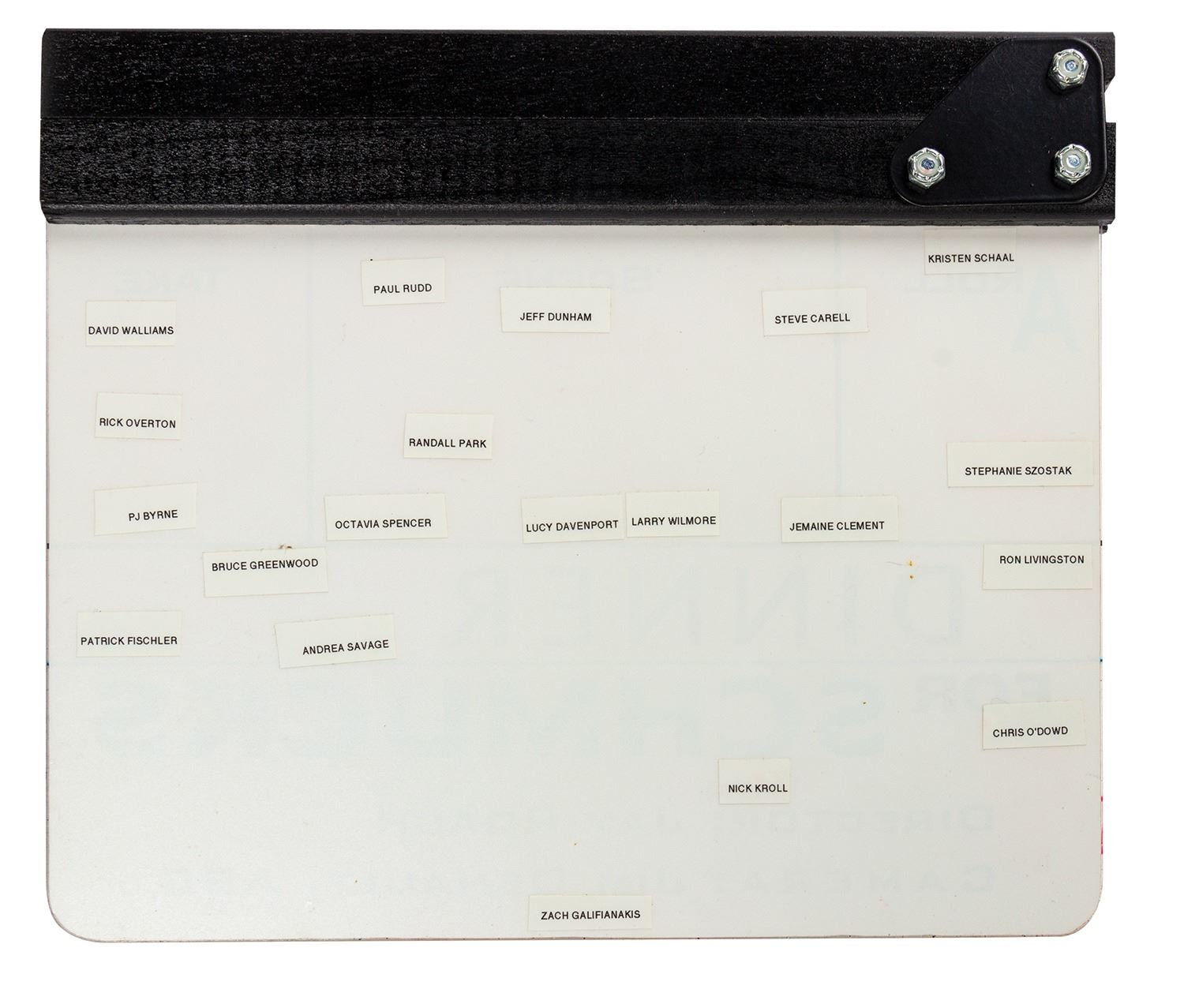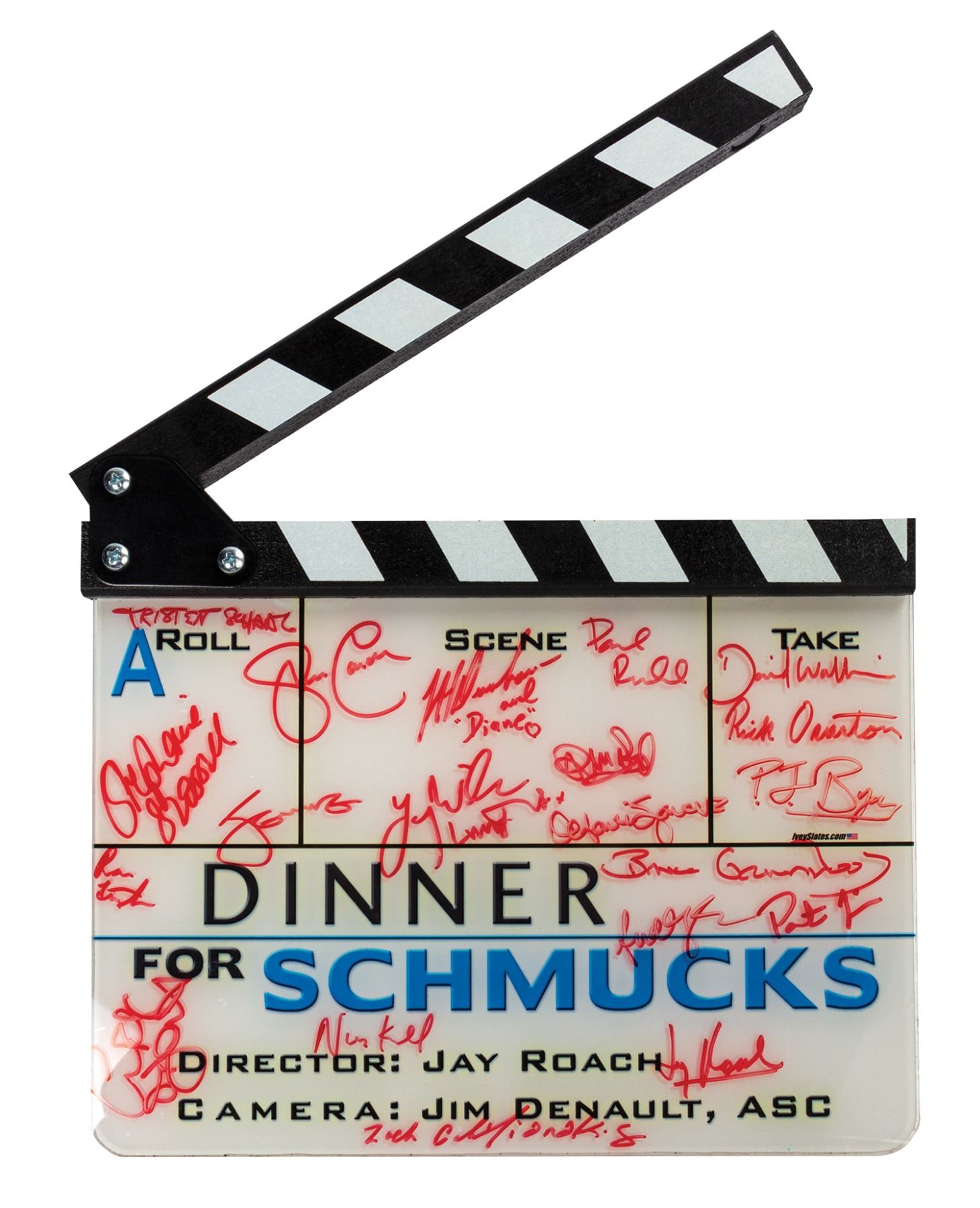 (DreamWorks, 2010) A multi-signed custom clapboard from the comedy film, Dinner for Schmucks. The film's title is displayed on the clapboard, and the clapboard features (20) signatures including Steve Carell, Paul Rudd, Zach Galifianakis, Nick Kroll, and many more. The clapboard measures 9.5"x11" and is in very good condition with minor wear. The reverse has the adhered printed names of the individuals that signed the front.