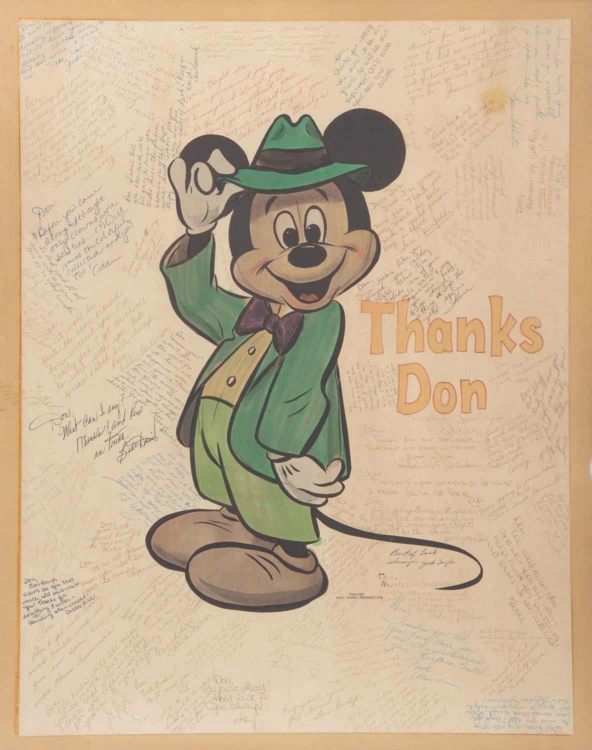 (Disneyland, 1960s-1970s) A Disneyland retirement gift featuring custom art of Mickey Mouse. The piece was created in honor of Don, a retiring Emporium Merchandise Supervisor, and signed with personalized messages from 63 Disneyland Cast Members. Measuring 17” x 22” in a 20.75” x 24.75” matte, the art displays in very good condition with a stain on the right side and light wear.