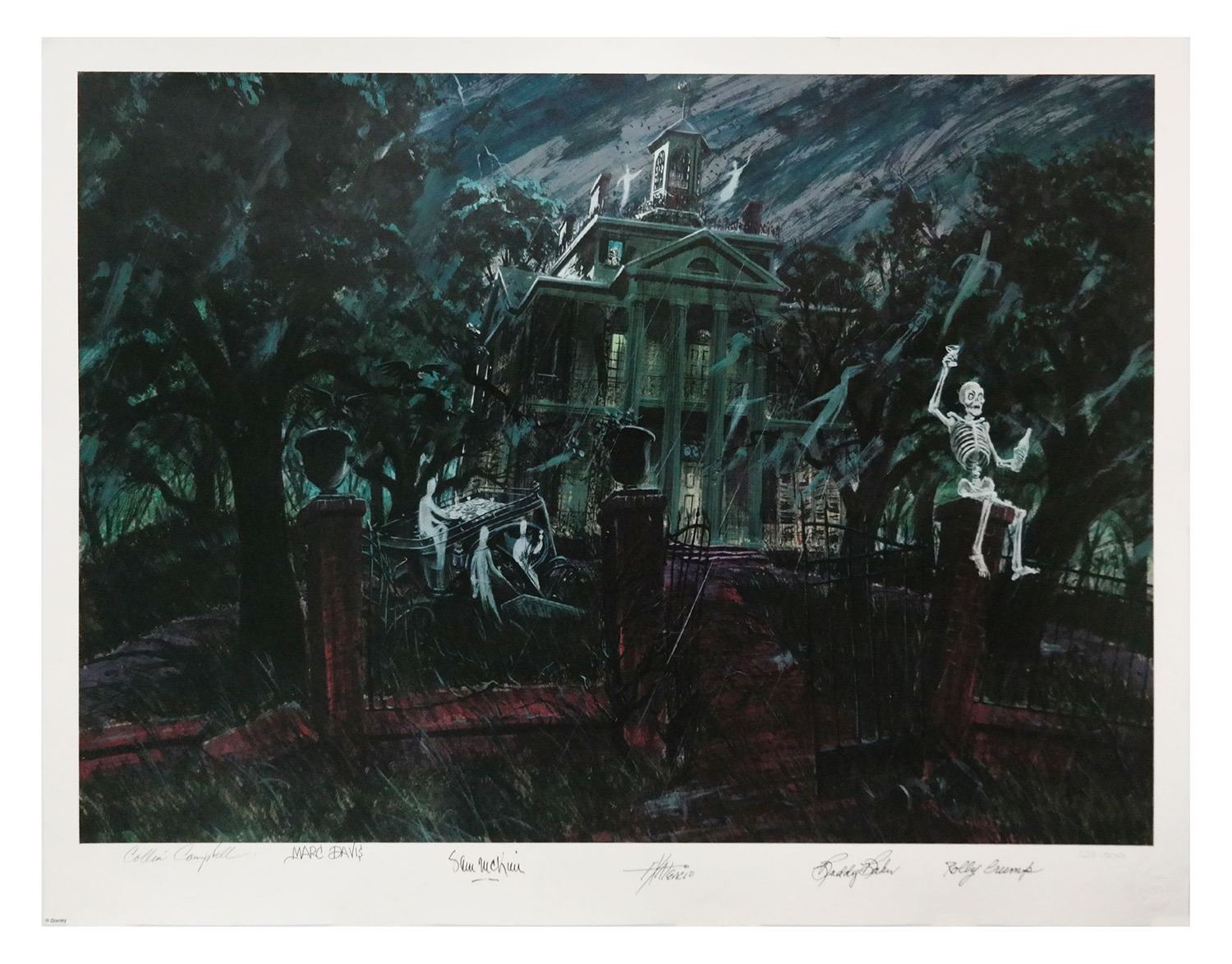 (Disneyland, c.1990s) A large limited edition print of Imagineer Colin Campbell's concept artwork for the Haunted Mansion. This print was created for the Disney Gallery and is signed by five Imagineers: Colin Campbell, Marc Davis, Sam McKim, X Atencio, and Rolly Crump, as well as Buddy Baker, who composed the music for the iconic song "Grim Grinning Ghosts." Measuring 21.5"x29.75", the print is in good condition with minor edge-wear and several small creases scattered throughout, and is hand-numbered 225/300.