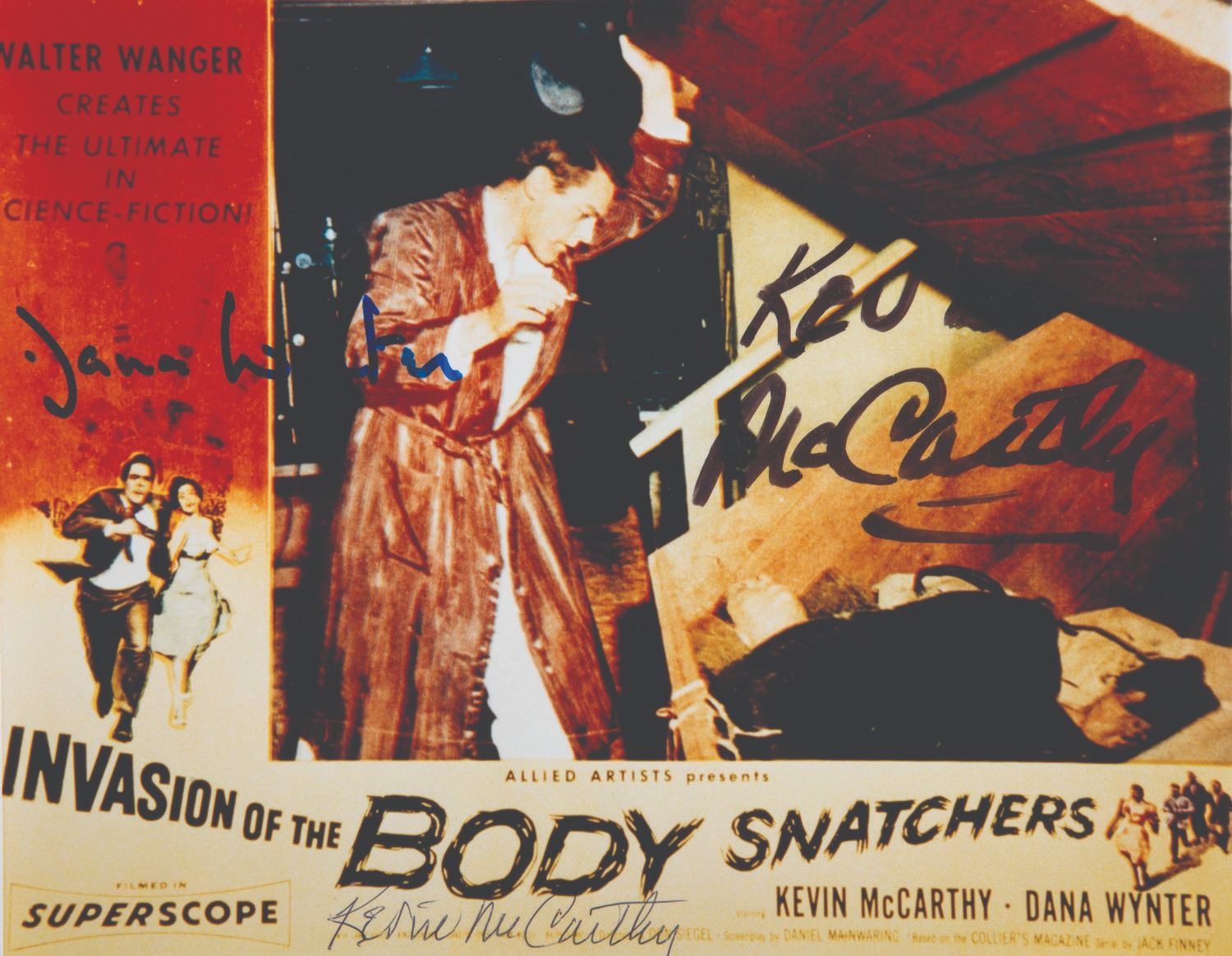 (Allied Artists, 1990s-2000s) A photo reproduction of a lobby card from the original 1956 Invasion Of The Body Snatchers, signed by the film's lead actors. Dana Wynter signed above her image, and Kevin McCarthy signed the photo twice, in ballpoint and in magic marker. Measuring 8"x10", the photo with autographs is in very good condition.