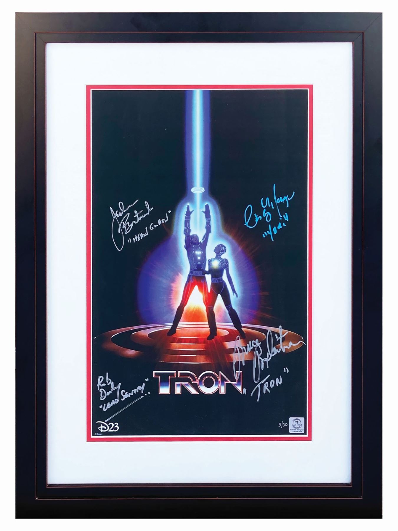 (Disney, c.2011) A multi-signed limited edition art print featuring the image from the Tron one sheet poster. The print has been signed by the film's cast members Bruce Boxleitner (Tron), Cindy Morgan (Yori), Jackson Bostwick (Head Guard), and Rob Daly (Lead Sentry). Offered exclusively through D23, and number 5 of only 50 offered, the print measures 16.5"x10.75" in its 24"x18" frame. The print appears to be in fine condition, though is unexamined out of frame.