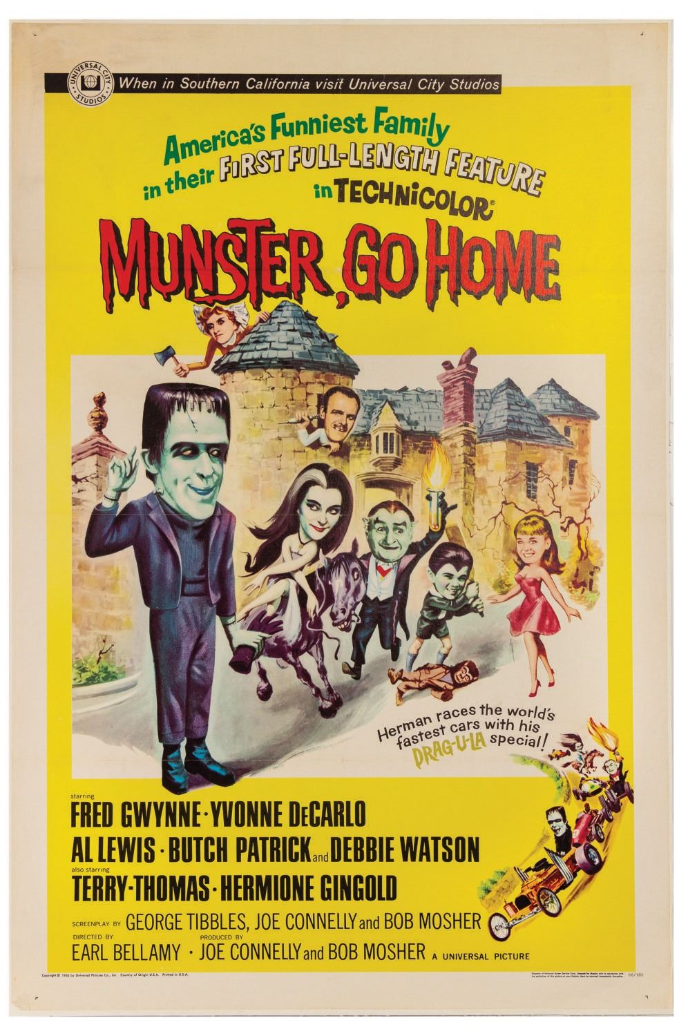 (Universal, 1966) An original poster for the comedy horror film Munster, Go Home. The film was based on the popular television show and notably featured the controversial casting of Debbie Watson as Marilyn Munster instead of Pat Priest, who portrayed the character on the television show. Measuring 41.25"x27.5", the poster is linen-backed and in good condition with a tear at the lower left corner, as well as a couple of small tears along the fold-lines. There are pin-marks in the corners.