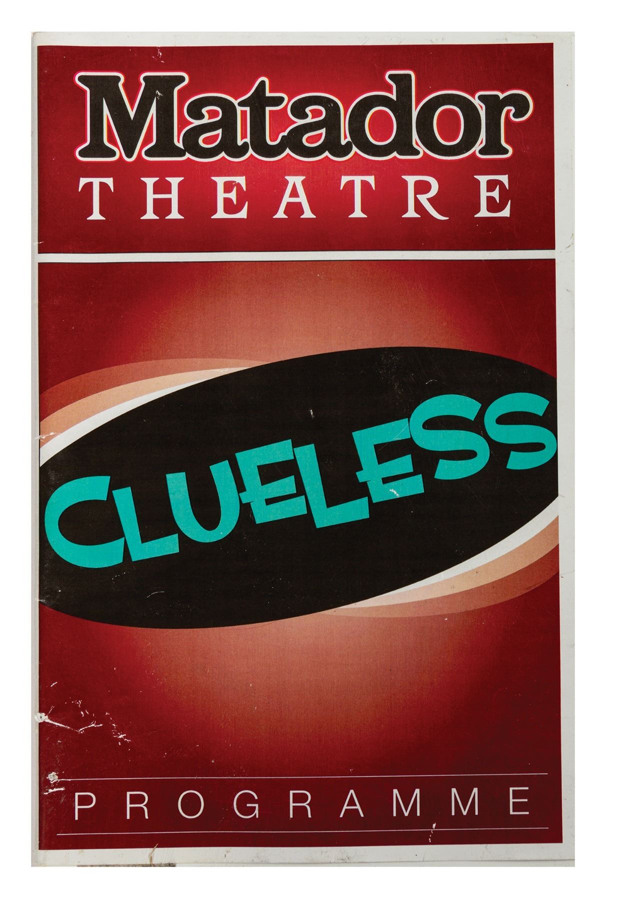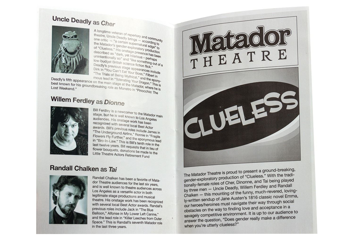 (Disney, 2015) A prop programme from the Muppets television show. The programme was created for the episode "Got Silk?" where Uncle Deady directs a stage adaptation of Clueless at the Matador Theater in Reseda. There are multiple pages in the programme, with the majority of the pages being either blank or containing sample test not intended to appear on screen. These types of pages are lightly taped together so when you open the programme you only see the pages that are meant to be shown. The center pages feature the cast of the fictitious production, including a bio of Uncle Deadly as Cher. The programme measures 8.5"x5.5" and is in good condition with some surface wear and creasing to the cover.