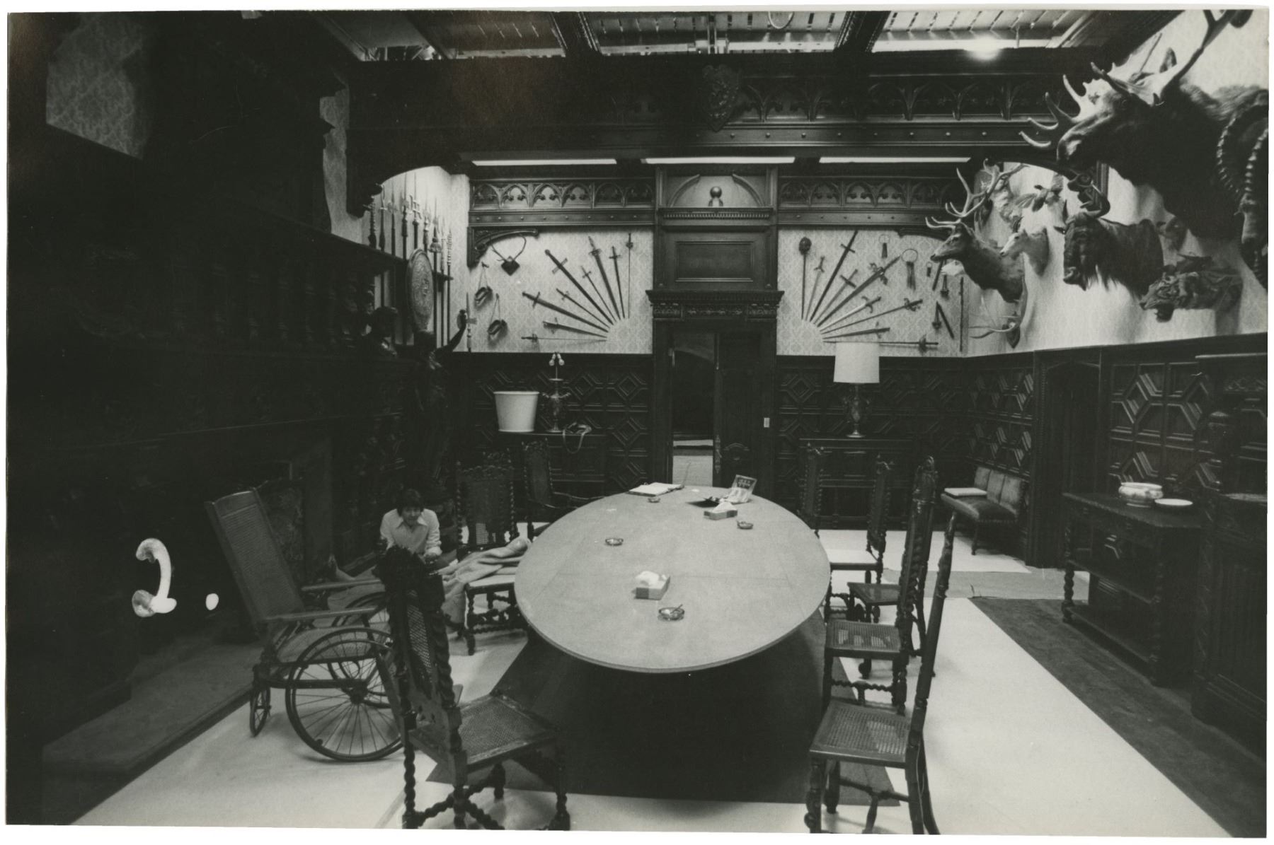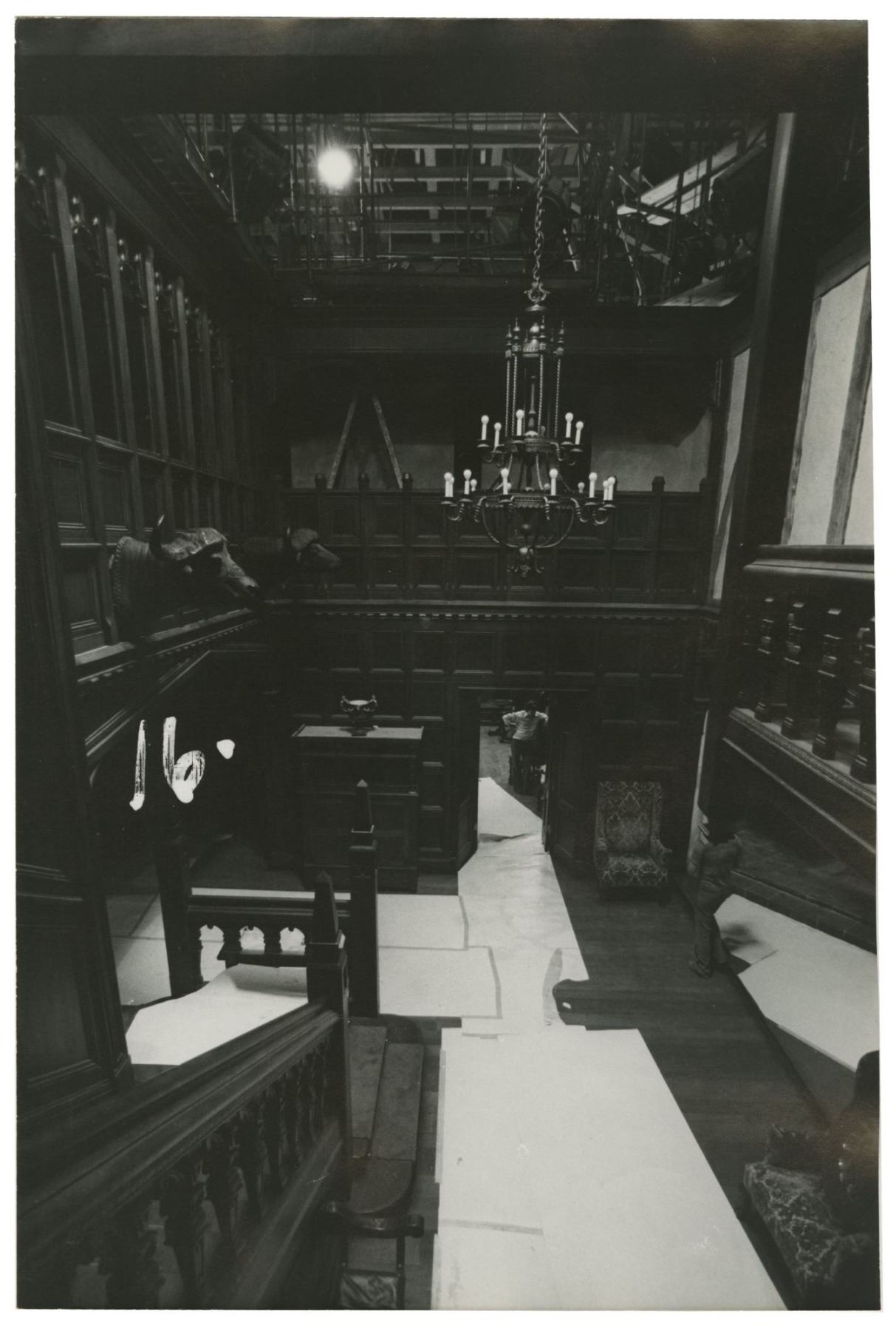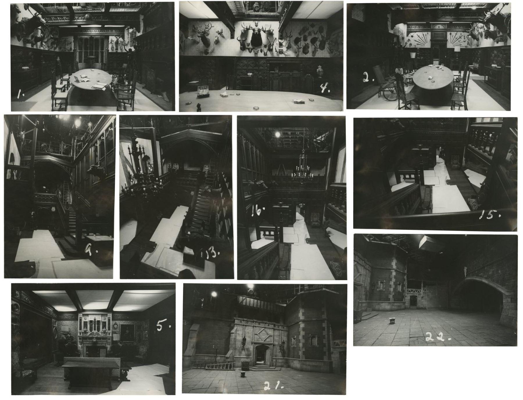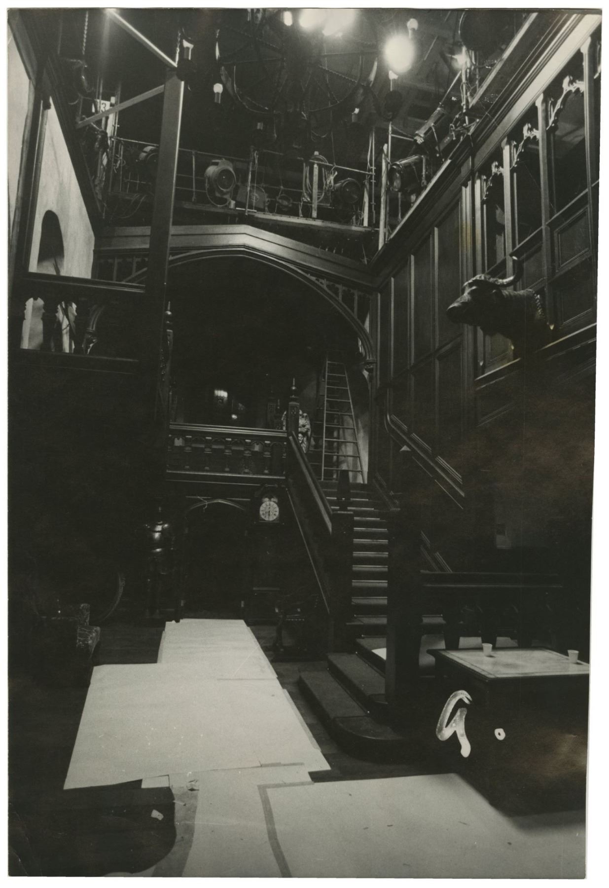 (Columbia, 1976) A set of (10) black and white reference photos of the production set used in the feature film "Murder by Death". These photos highlight many aspects of the iconic mansion seen throughout the film such as the dining room and the exterior of the mansion, and provide angles and details that would otherwise be difficult to observe. The photos measure 9.5"x14" each, and the condition is very good overall with some waviness to the paper and minor creasing from use and age.