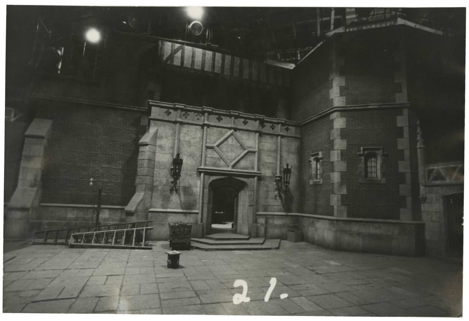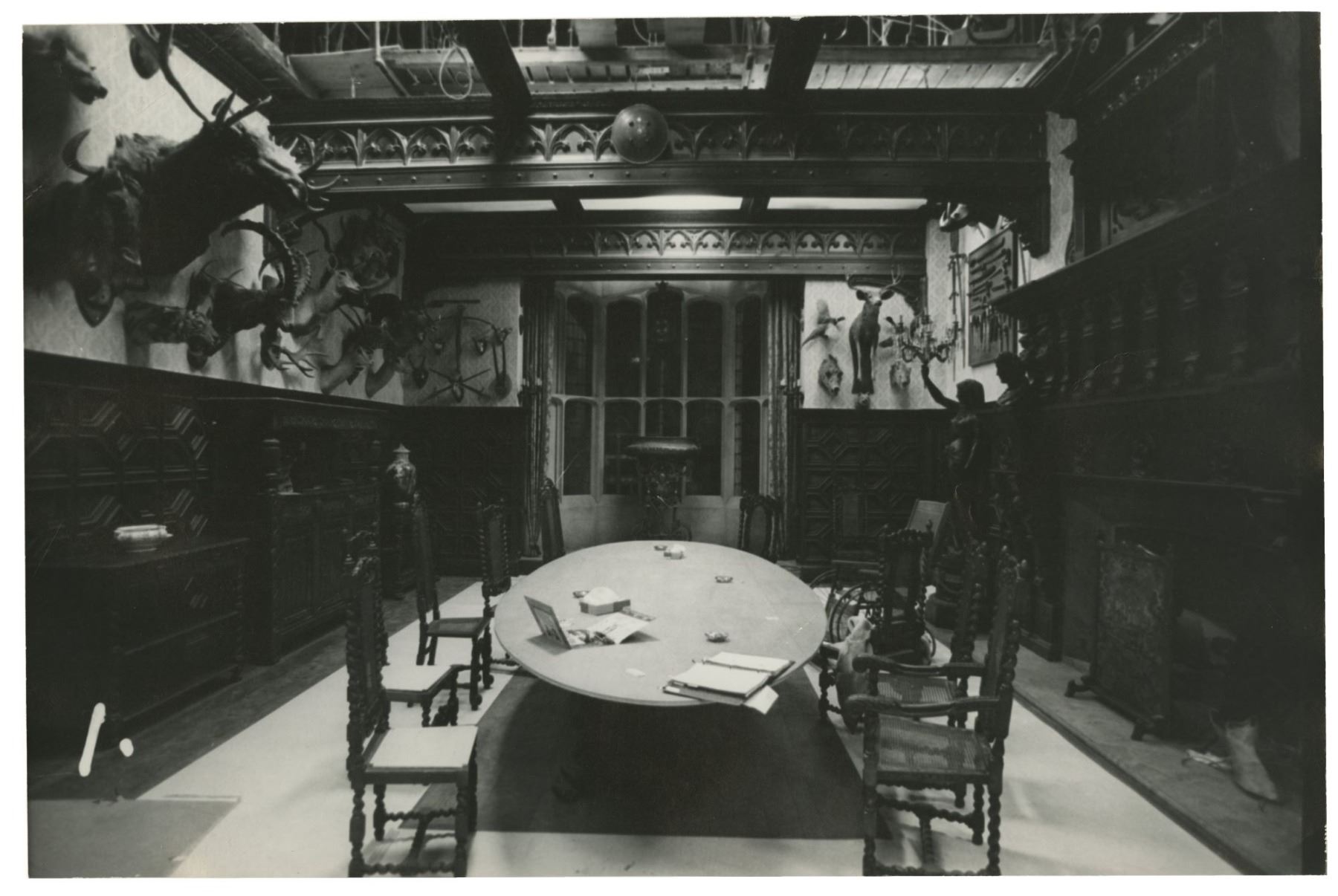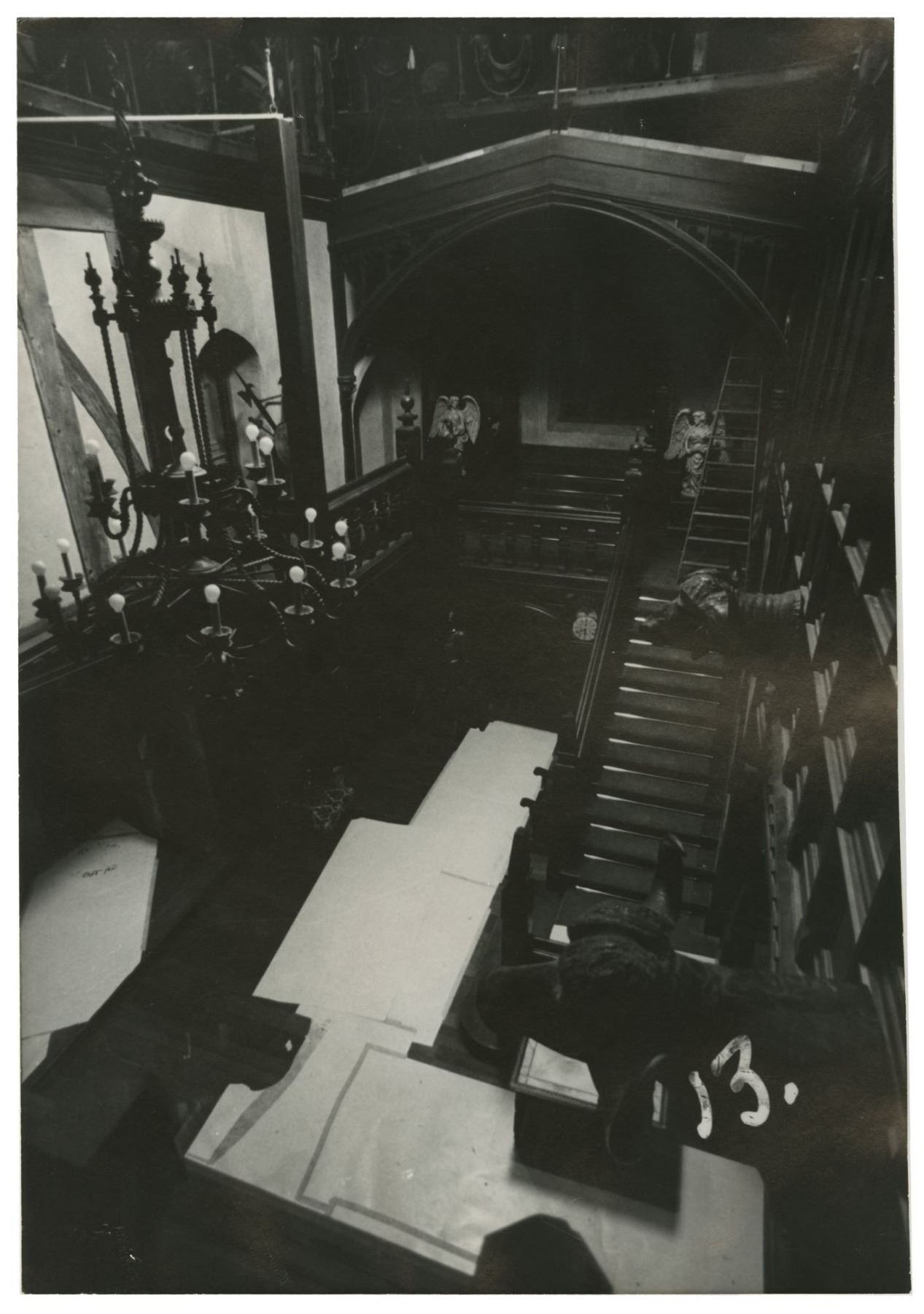 (Columbia, 1976) A set of (10) black and white reference photos of the production set used in the feature film "Murder by Death". These photos highlight many aspects of the iconic mansion seen throughout the film such as the dining room and the exterior of the mansion, and provide angles and details that would otherwise be difficult to observe. The photos measure 9.5"x14" each, and the condition is very good overall with some waviness to the paper and minor creasing from use and age.