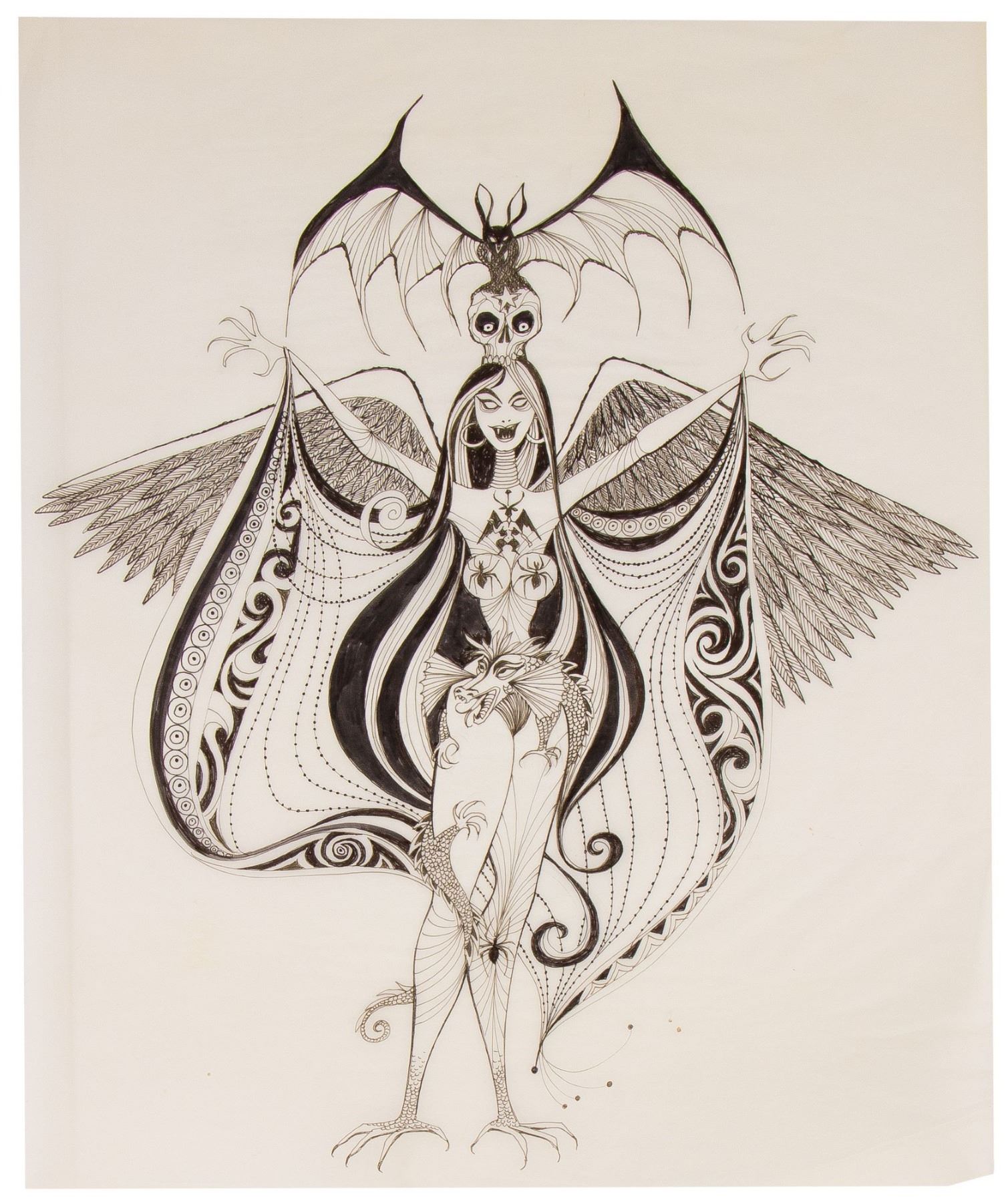 (c.1965) An original concept illustration by Rolly Crump for the "Museum of the Weird". This Mistress of Evil was designed to appear to float in the air and let out screams similar to Maleficent in Sleeping Beauty. The illustration is accomplished in ink on vellum and measures 17"x14". The condition is very good with a few faint creases around the border.