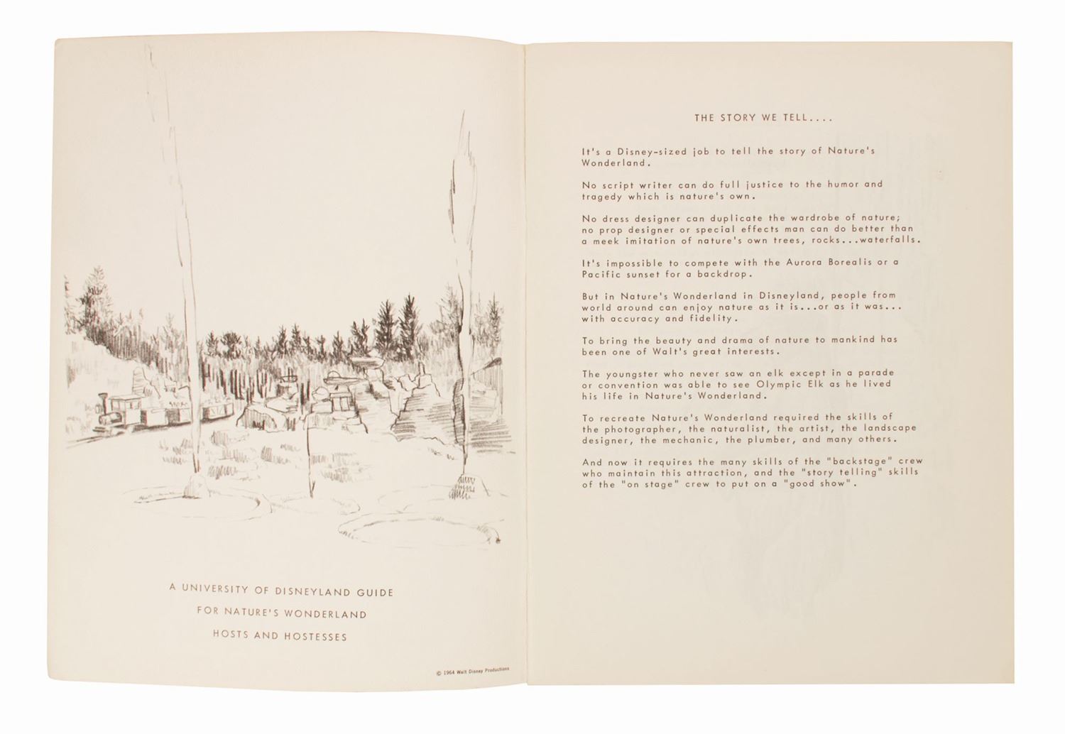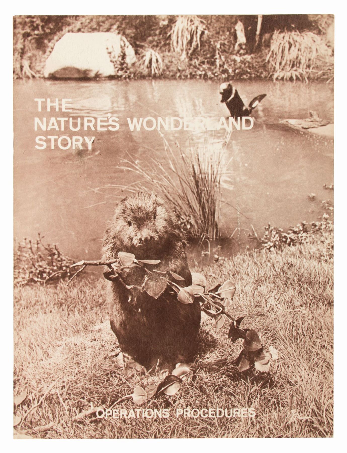 (Disneyland, 1964) A rare cast member manual titled "The Nature’s Wonderland Story." This thorough guide was created by the University of Disneyland for Mine Train Through Nature’s Wonderland hosts and hostesses, covering the history behind the attraction, operational procedures, safety requirements, host demeanor, cleanliness standards, and more. The 26-page booklet measures 11”x8.5” and is in very good condition with some scuffing and browning to the extreme edges of the back cover, and an upper right corner crease to the back cover and the last page of the manual.