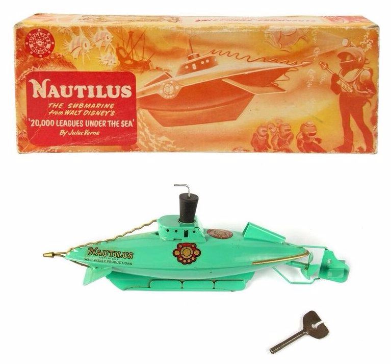 (Disneyland, c.1955) A blue-green enameled tin wind-up Nautilus toy based on Walt Disney's "20,000 Leagues Under the Sea". This item comes with its original box and inner packaging, as well as its wind-up key. This item measures approximately 10" long and is in good condition, with some wear throughout from use, and still functions normally.