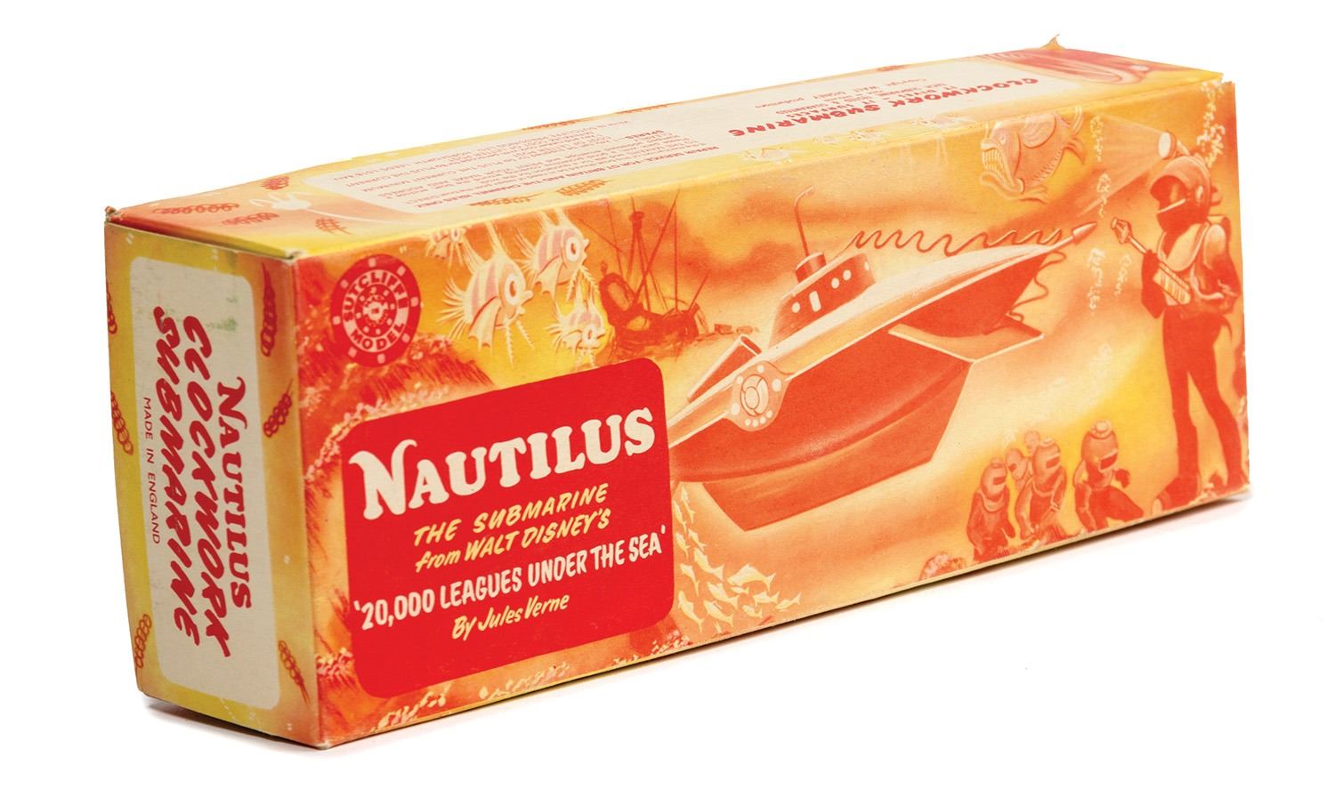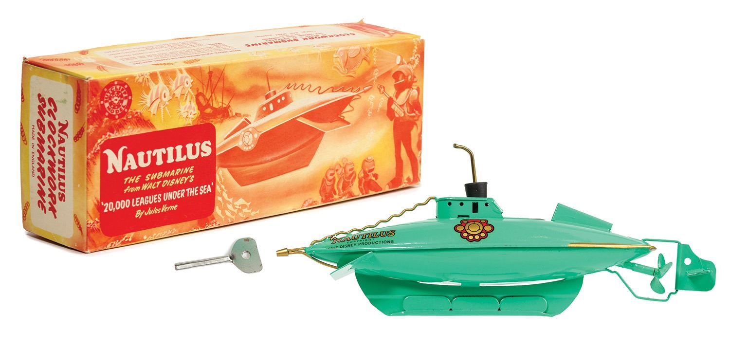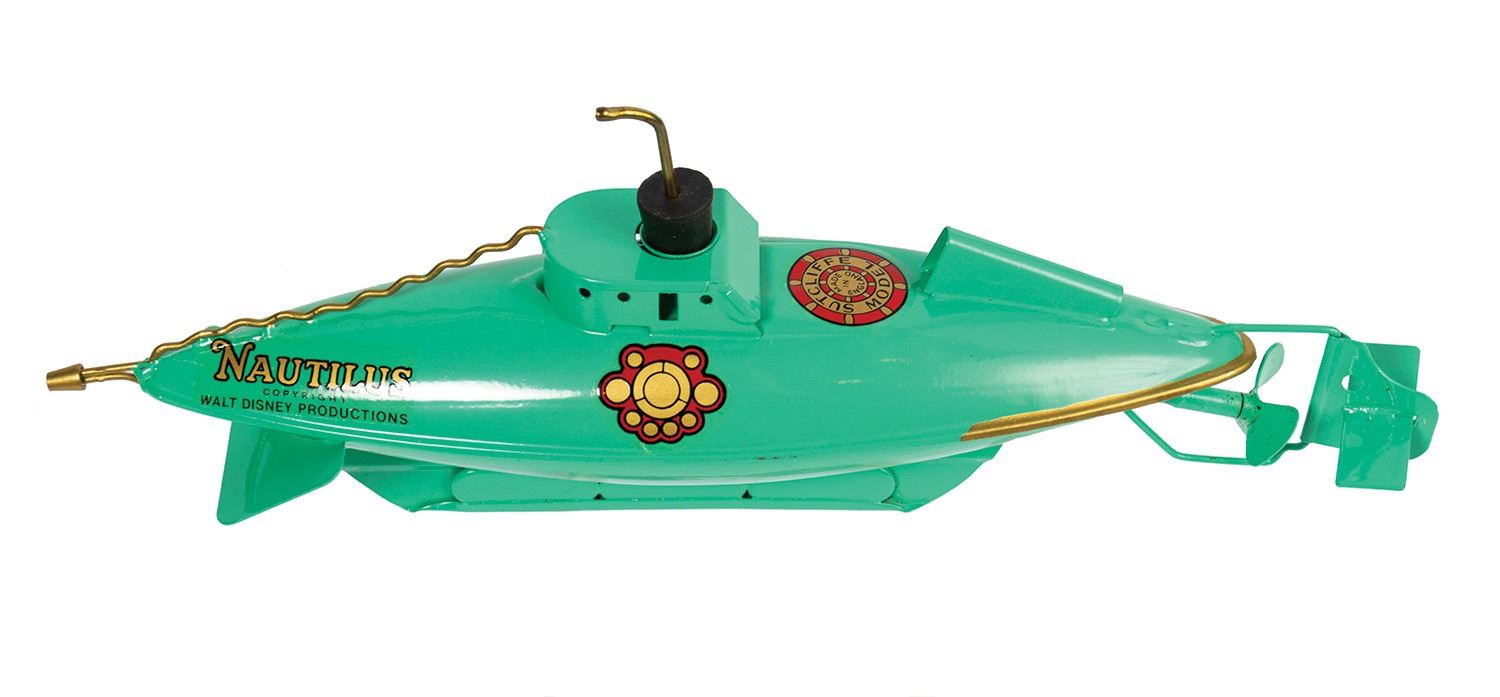(Disneyland, c.1955) A rare tin wind-up Nautilus toy based on Walt Disney's 20,000 Leagues Under the Sea. The toy still includes its turn-key and rubber cork, and comes in its original box. The toy functions very well and measures approximately 10" long. The condition of both the toy and the box is very fine with little wear.