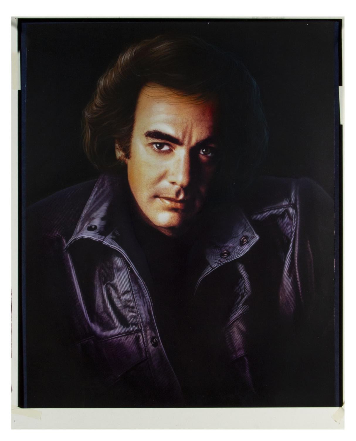 (1990s) This large photo of Neil Diamond features original airbrushed artwork in Diamond's hair, eyes, face, and jacket, which was used to create a concert t-shirt that was sold during the singer's tours throughout the 1990s. The artwork has an image size of 23"x20" and is adhered over a 25.5"x21" artist's board backing. The artwork has a clear protective cover hinged over the top and the condition is very good overall with minor wear from use.