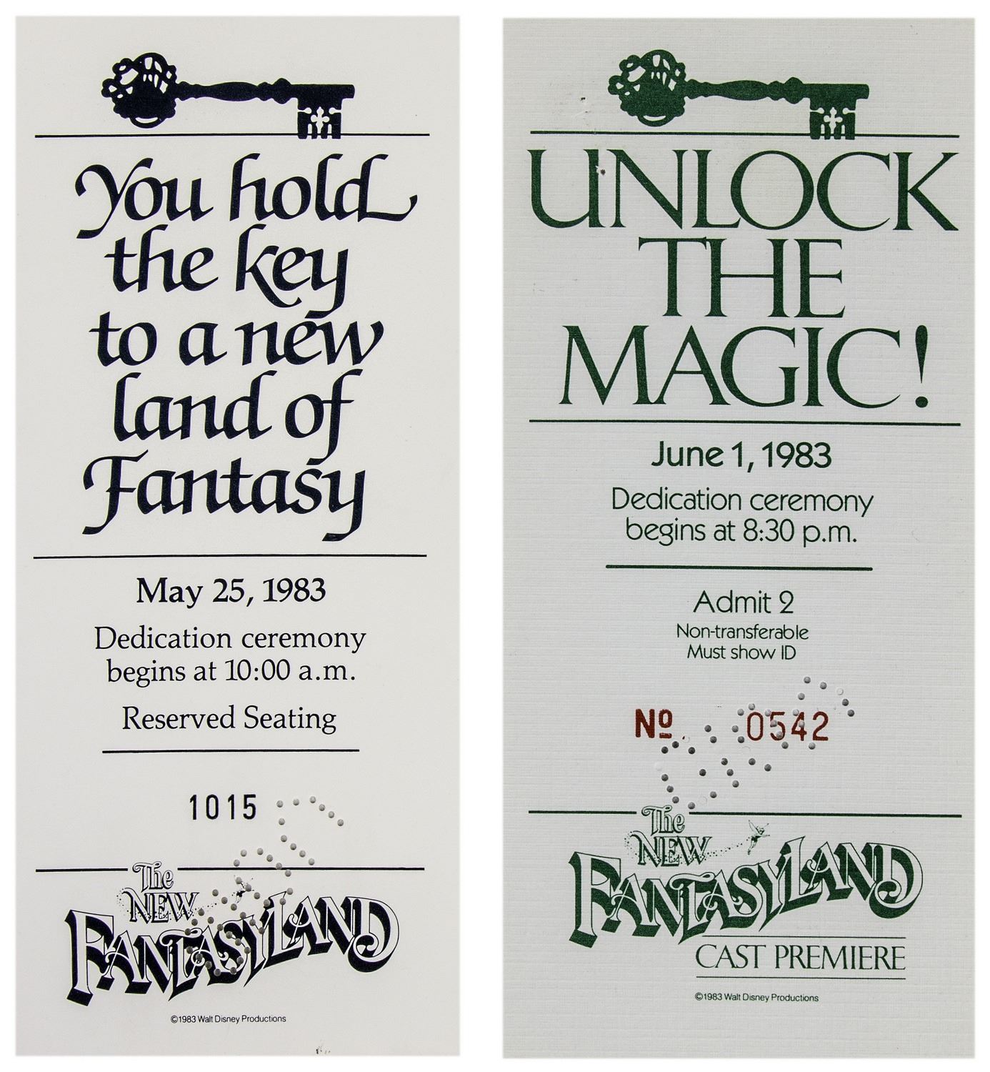 (Disneyland, 1983) A pair of (2) tickets for the "New Fantasyland" dedication ceremonies in 1983. These tickets are for ceremonies on May 25 and June 1, with the latter ticket marked "Cast Premiere". The tickets measure 6.5"x3" and the pair is in very good condition with little wear. The word "void" is punched into both tickets.