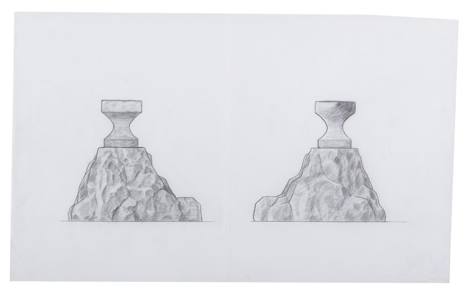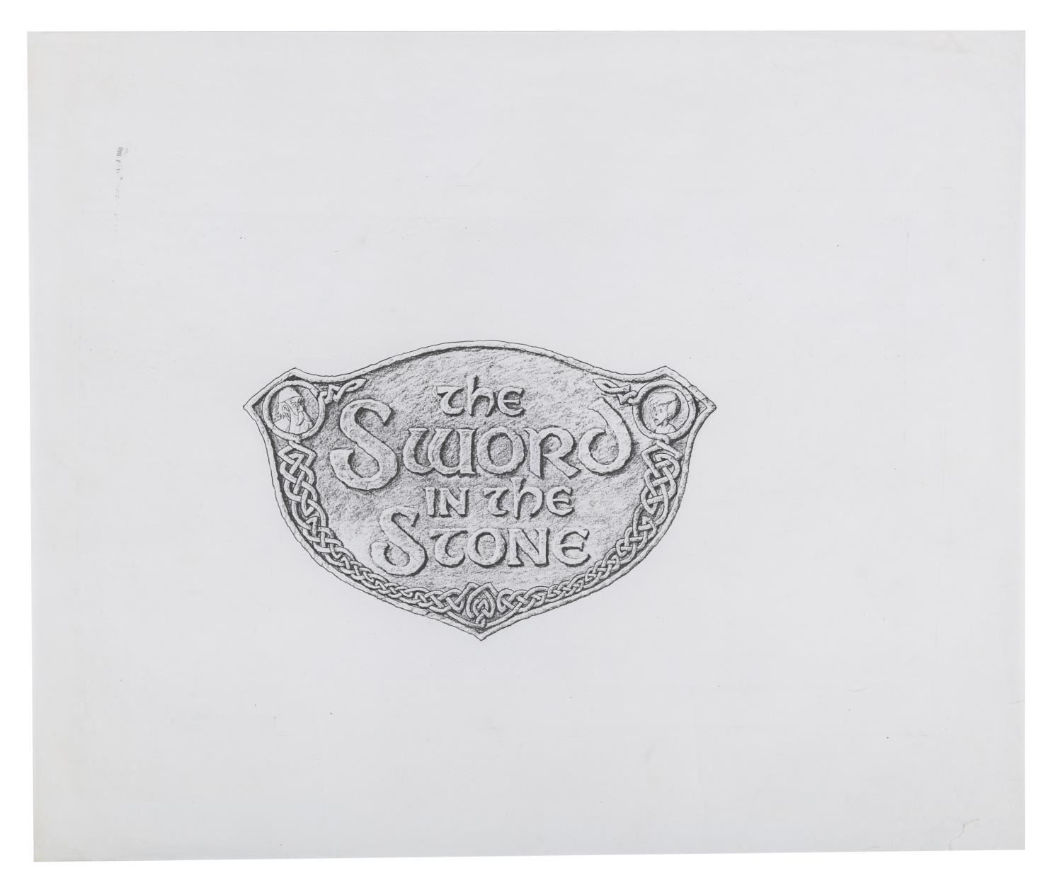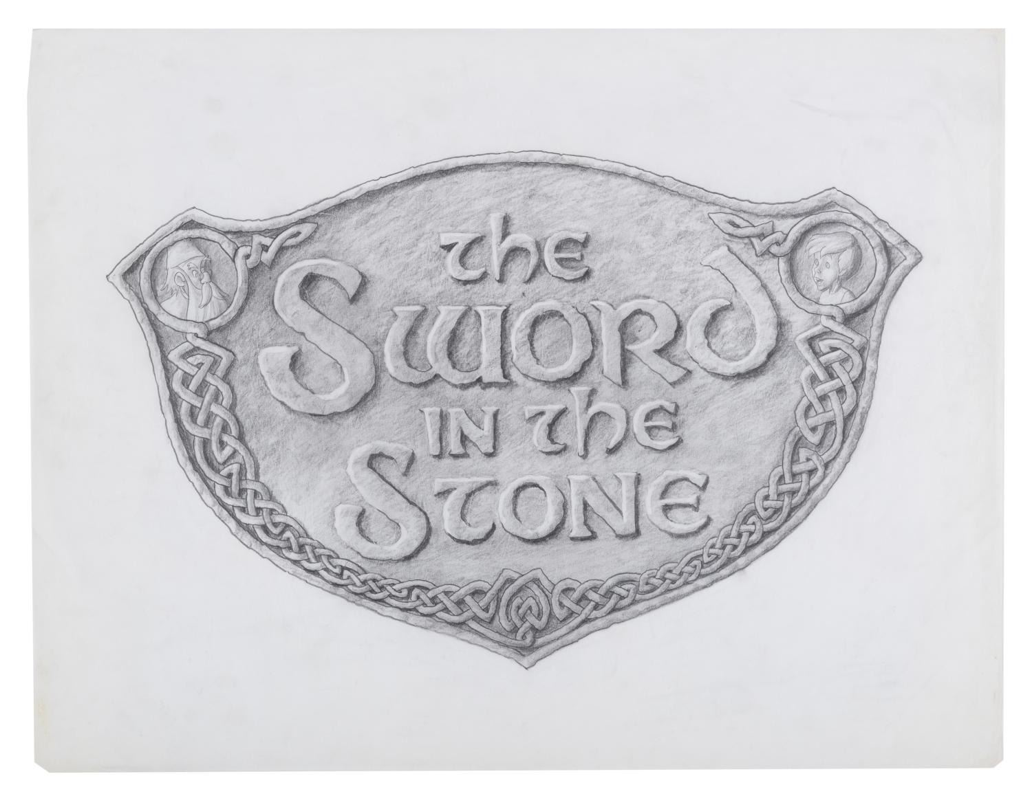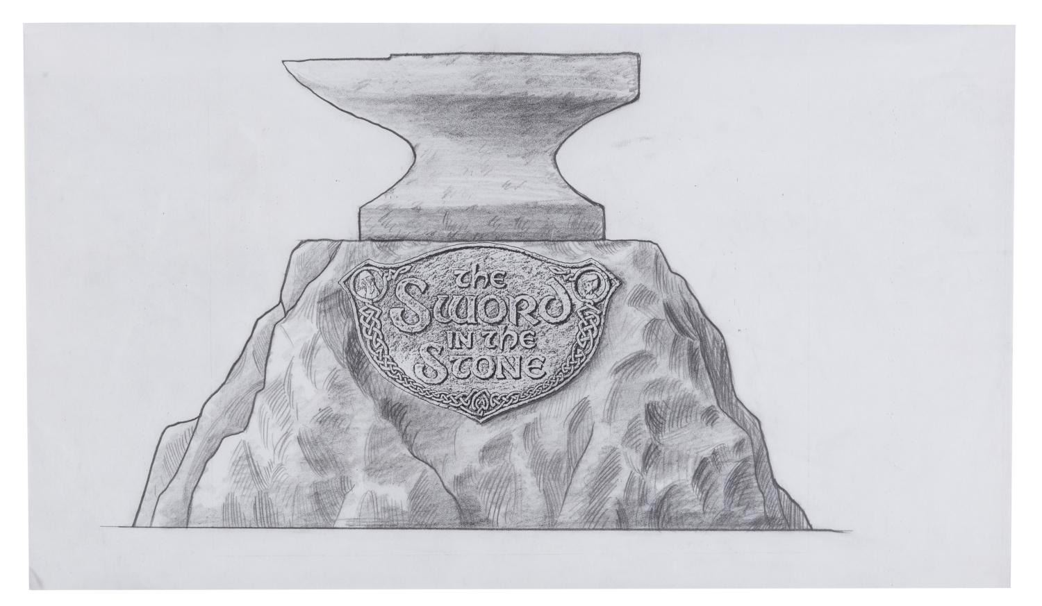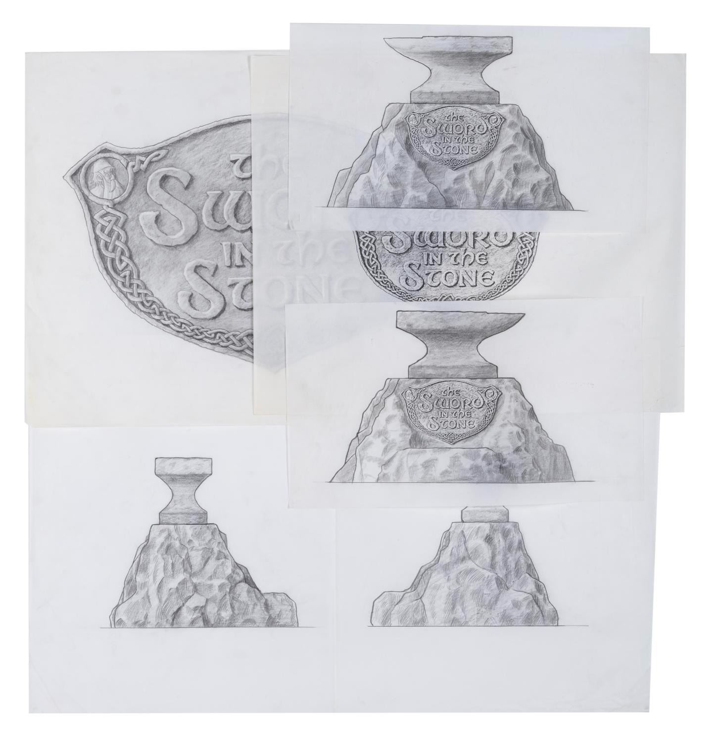 (Disneyland, 1983) A collection of five concept drawings for Disneyland's "The Sword in the Stone" experience. Part of 1983's New Fantasyland revamp at the Park, the plaque features Merlin and Wort and involved a Merlin-led ceremony where a Guest was able to remove the sword from the stone. The graphite concept drawings have image sizes from 8.75" x 14" to 13" x 20.25" on vellum measuring from 10.5" x 18" to 19.25" x 32". The artwork is in good condition with creases, folds, smudges, and wear from production use.
