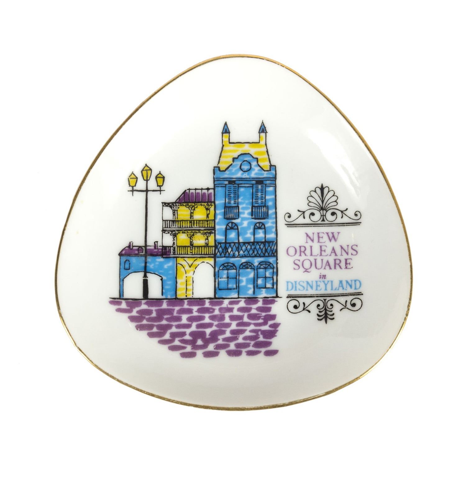 (Disneyland, c.1966) A rounded dish featuring artwork based on Disneyland's New Orleans Square. The brick and wrought iron designs and blue, yellow, and purple imagery seen on this dish wonderfully represent this guest-favorite land. Measuring 4.5"x4.5", the dish is in good condition with minor surface wear from previous display.
