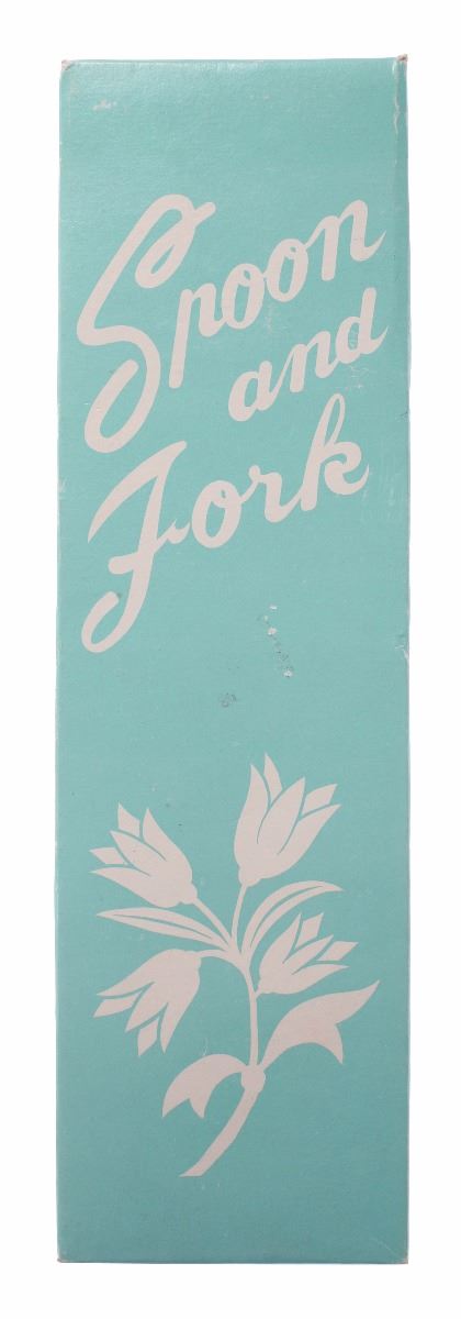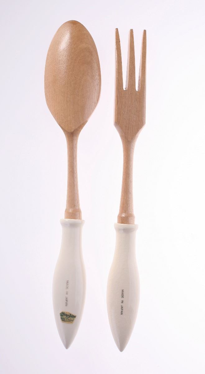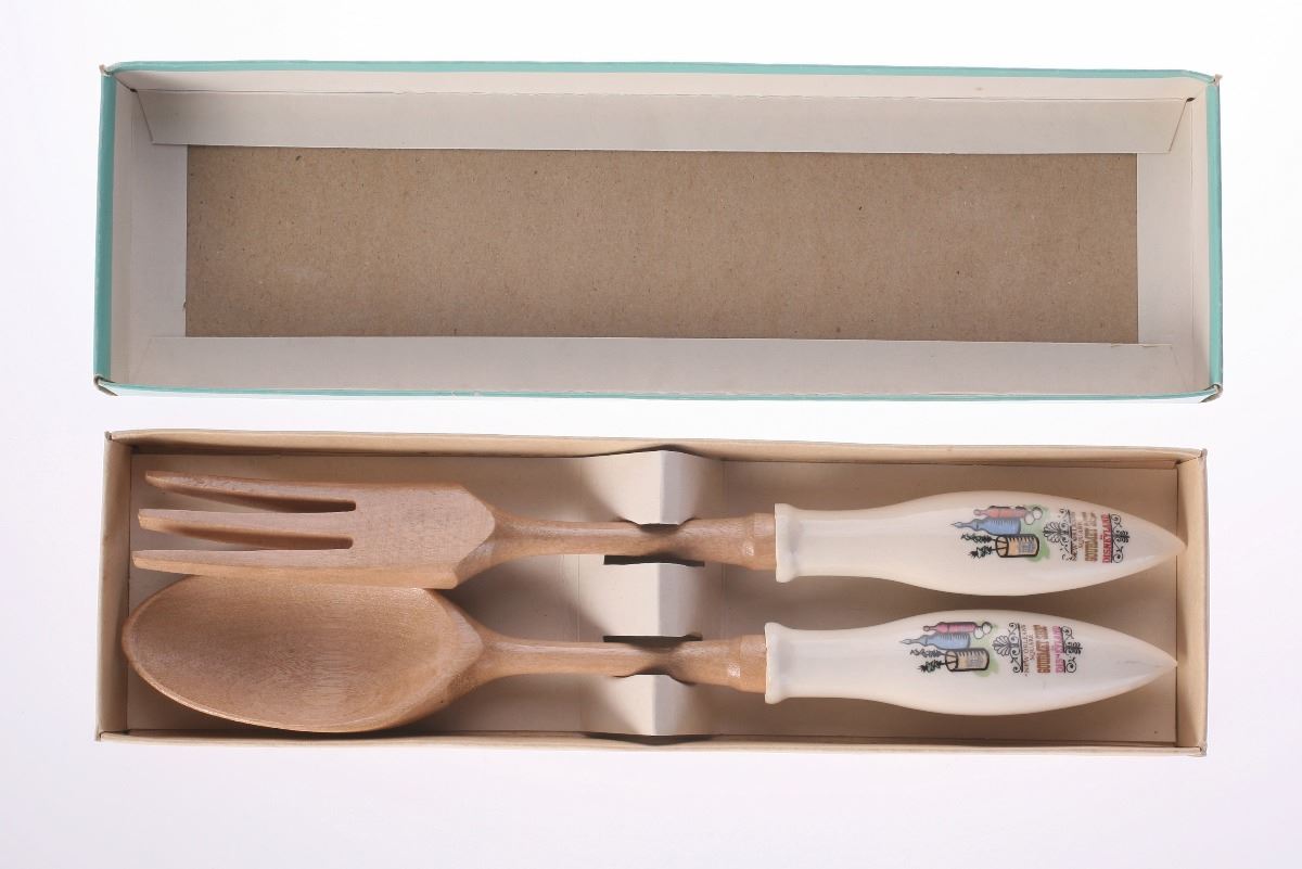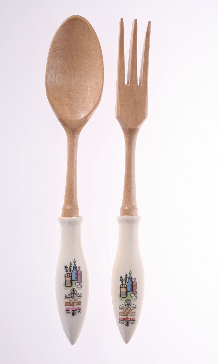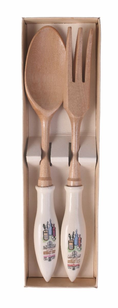 (Disneyland, 1967) Large wooden spoon and fork set with New Orleans Square imagery along the handles. Spoon still retains its Disneyland sales sticker on the back. Pair comes in its original box. Box measures 3.5"x1"x11.75". In good condition with some wear to the box.