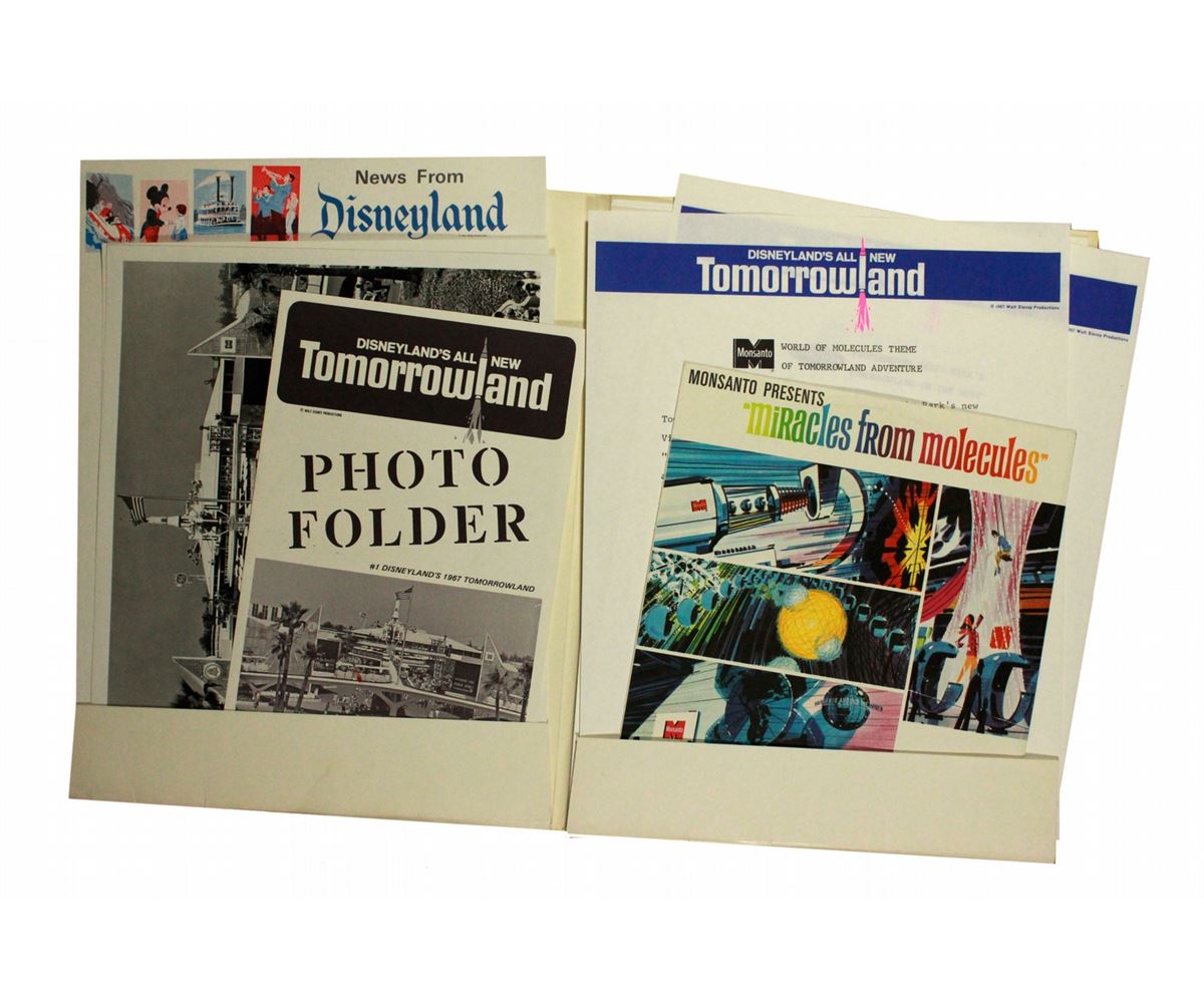 (Disneyland, 1967) A handsome collection of materials for the world-wide press event celebrating the opening of Disneyland’s “New Tomorrowland””in the Summer of 1967. Given to invited press attendees, this folder is brimming with information on the latest expansion of Disneyland since 1959. Items include press photo stills, press information sheets, a photo folder (with used photo coupon) and the ultra-rare Miracles From Molecules theme song 33 rpm record from Monsanto’s presentation of “Adventure Thru Inner Space. Written by the prolific Sherman Brothers, the catchy tune was briefly available for purchase at the Tomorrowland Character Shop that summer. The record and jacket appear unplayed and in excellent condition as is the rest of this rare kit. Measuring 11.5 x 9 in. and in very good condition.