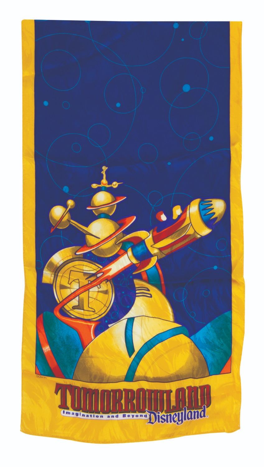 (Disneyland, 1992) A New Tomorrowland Cast Member exclusive silk scarf and tie. The pair features Imagineer Joe Spencer's powerful imagery of the Orbitron, and the concise expression "Tomorrowland - Imagination and Beyond" established in a bold color palette. The 100% silk scarf measures 42"x11", and the tie measures 54" long. Both items are in very good condition.