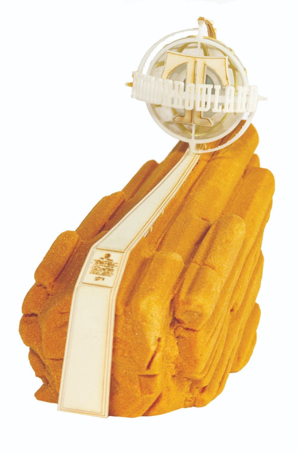 (Disneyland, 1998) An original maquette created by Walt Disney Imagineering for the Tomorrowland entrance monument installed during the New Tomorrowland refurbishment of 1998. Constructed of foam, paper board, and laser cut plastic elements, the monument maquette features the New Tomorrowland half-globe logo atop raw foam hand-carved rock work to appear as a hunk of grooved "metal ore." This one-of-a-kind maquette served an important role in the design process and is almost identical to the resulting park landmark. Measuring approximately 6.25"x3" and 7" deep, the piece is in very good condition with some cracking and flaking to the foam.