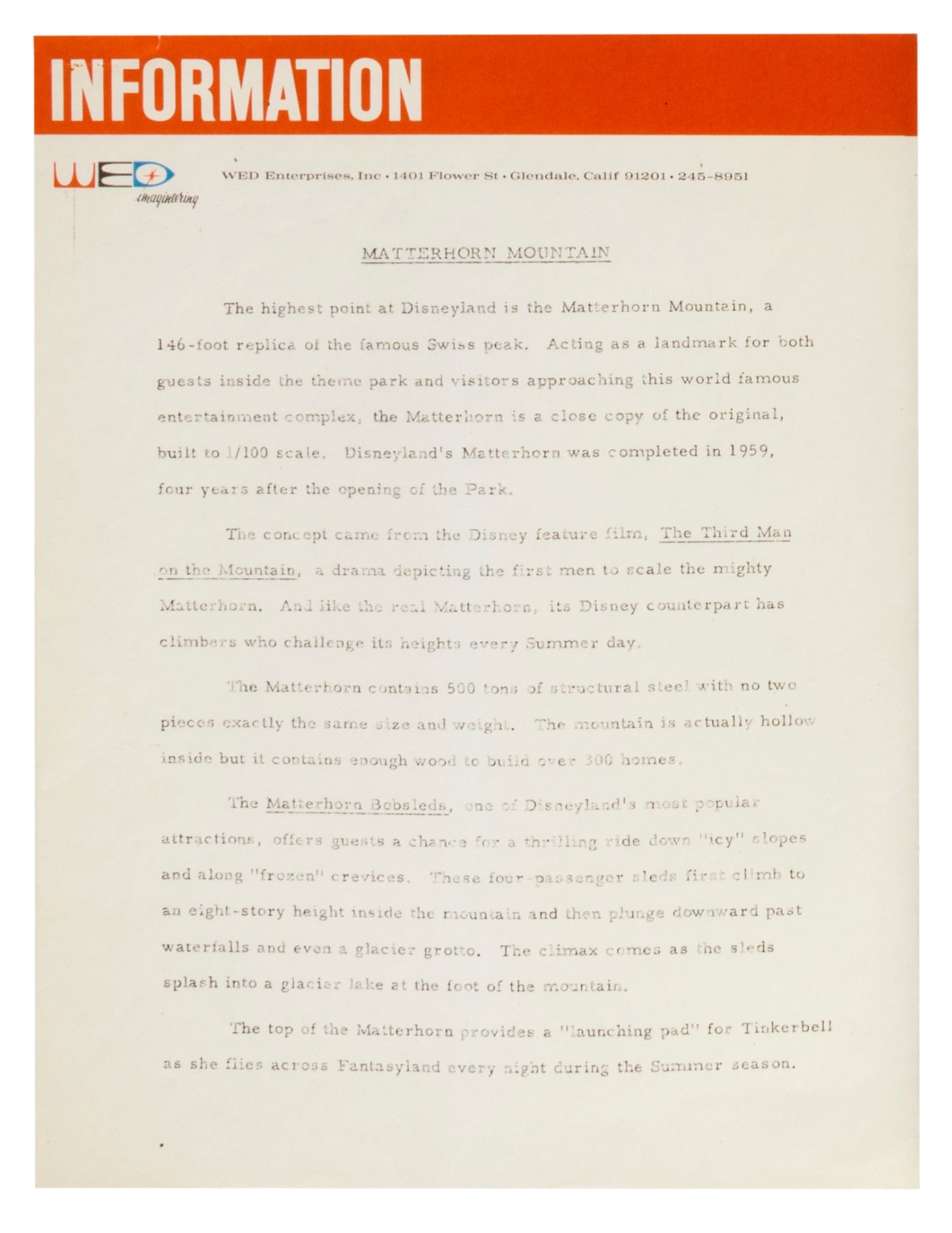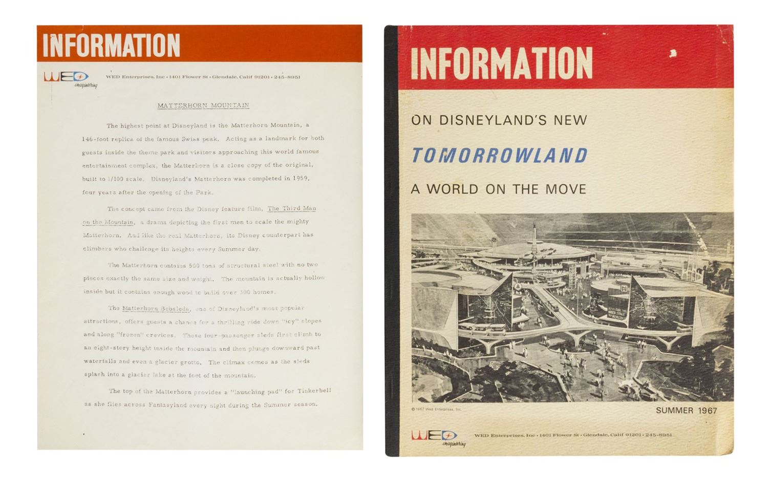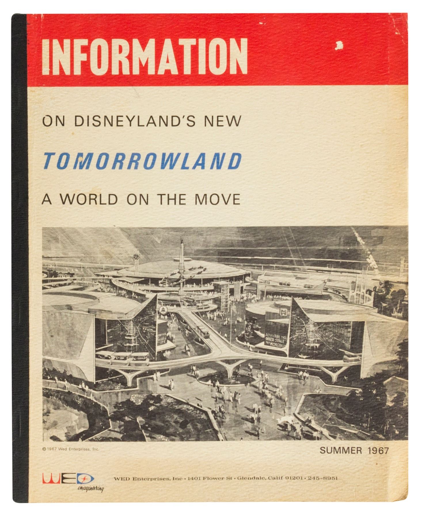 (Disneyland, 1967) An informational booklet for the new Tomorrowland, paired with a press release on the Matterhorn Mountain. The booklet contains information on each attraction that was part of the new land refurbishment, as well as general information on WED Imagineering and audio-animatronics. The press release measures 11"x8.5" and the 27-page booklet measures 11"x9". The booklet is in fair condition overall with heavy edge-wear, particularly along the outer edge where there is bending and creasing. There is some surface wear and discoloration from age and use. The press release is in good condition with some color wear to the text, though it is possible that this is original to the printing.