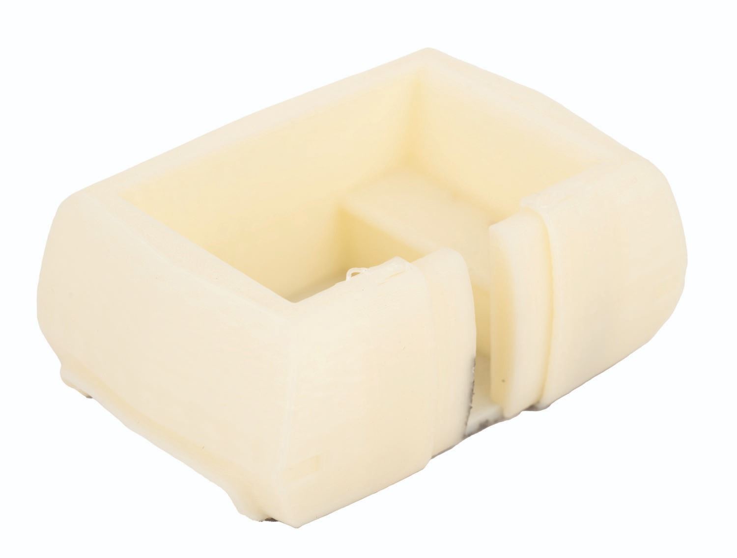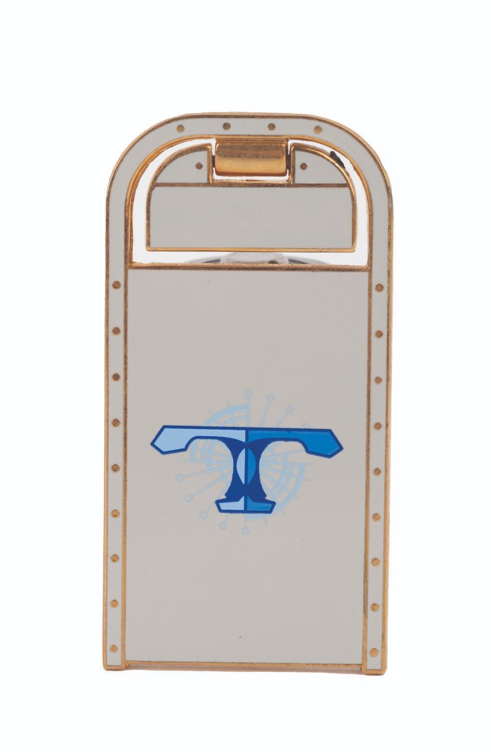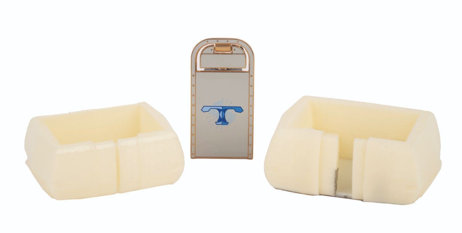 (WDI/Disneyland, 2000s) A New Tomorrowland Trash Can Pin and PeopleMover Models. The pin was a Walt Disney Imagineering Exclusive and was limited to an edition of 300. The pair of PoepleMover models depict the chassis with its doors opened and closed, and were created with an unknown intent. Measuring 1"x2", the LE300 WDI Trash Can Pin is in fine condition with a functioning hinge feature. Measuring 2.75"x1.75"x1" and 2.25"x1.25"x1", the pair of 3-D printed plastic miniatures are in very good condition with black scuffing on the bottom of one.